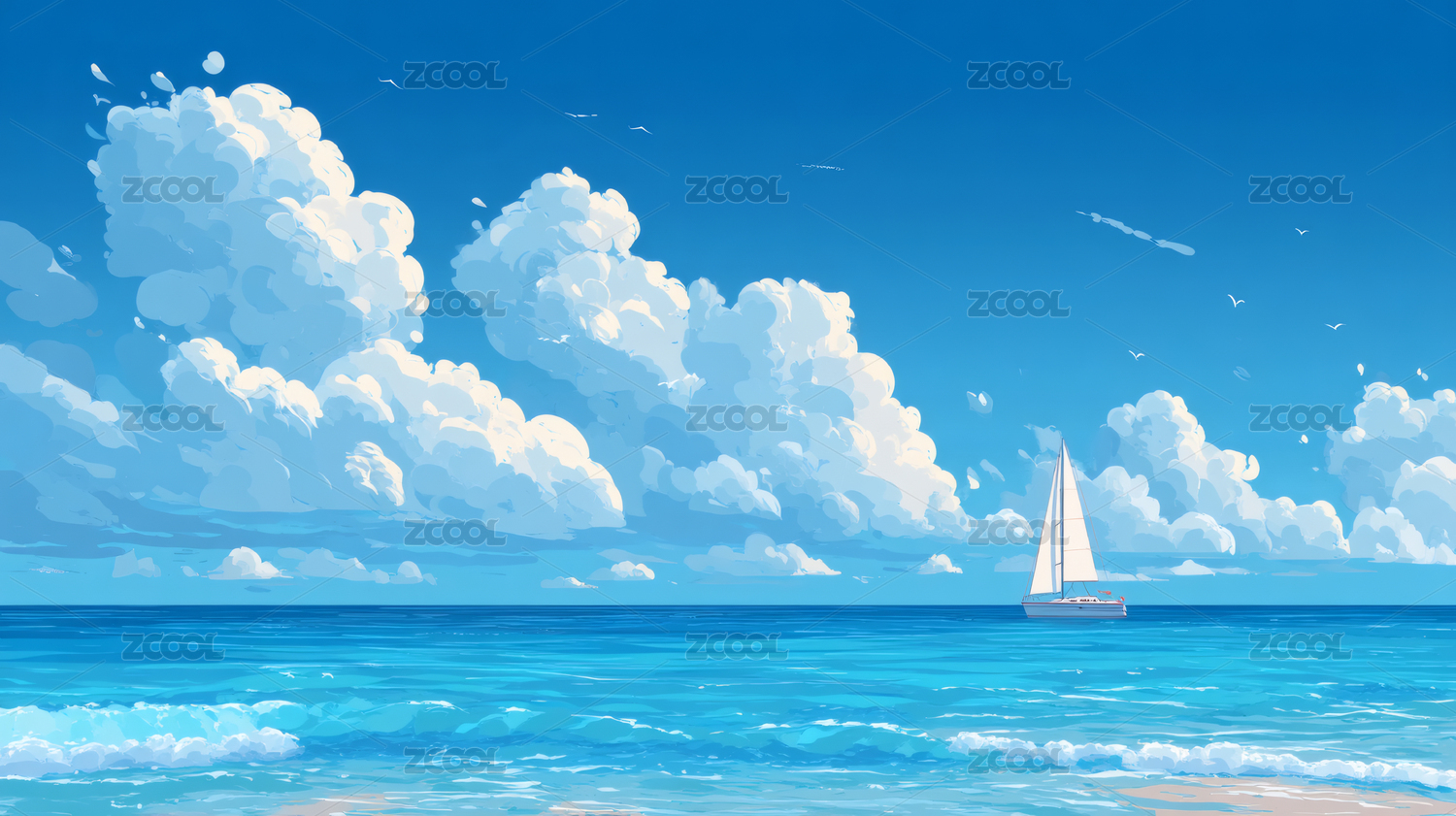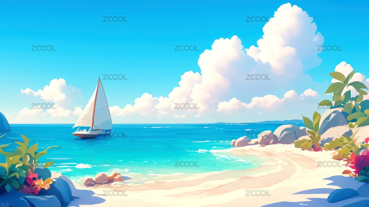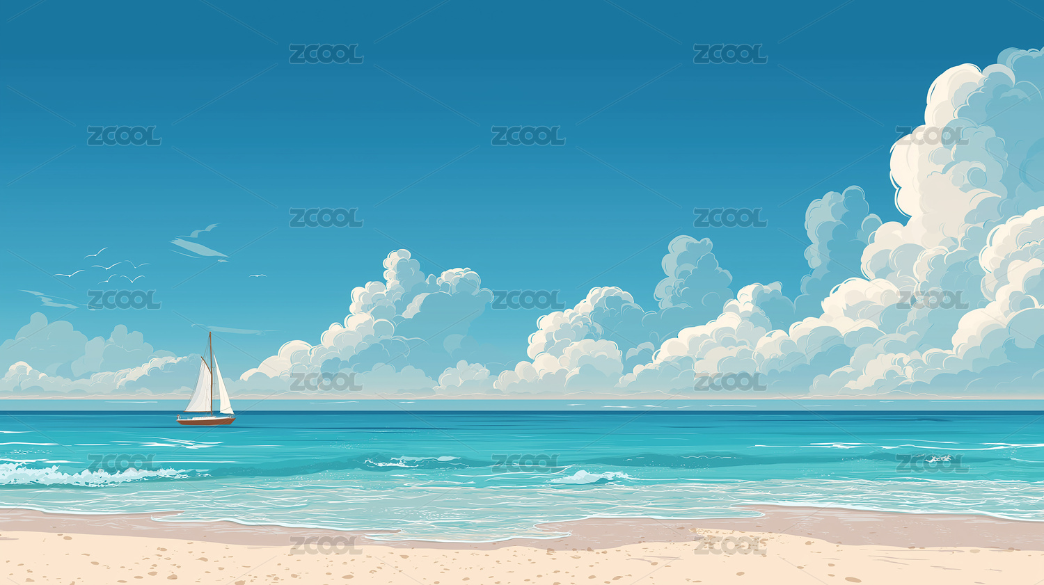 卡通风格蓝天白云大海沙滩背景下的一艘帆船