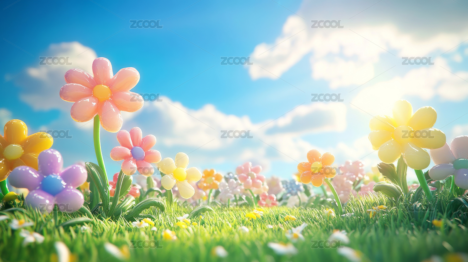卡通花朵多彩蓝天场景