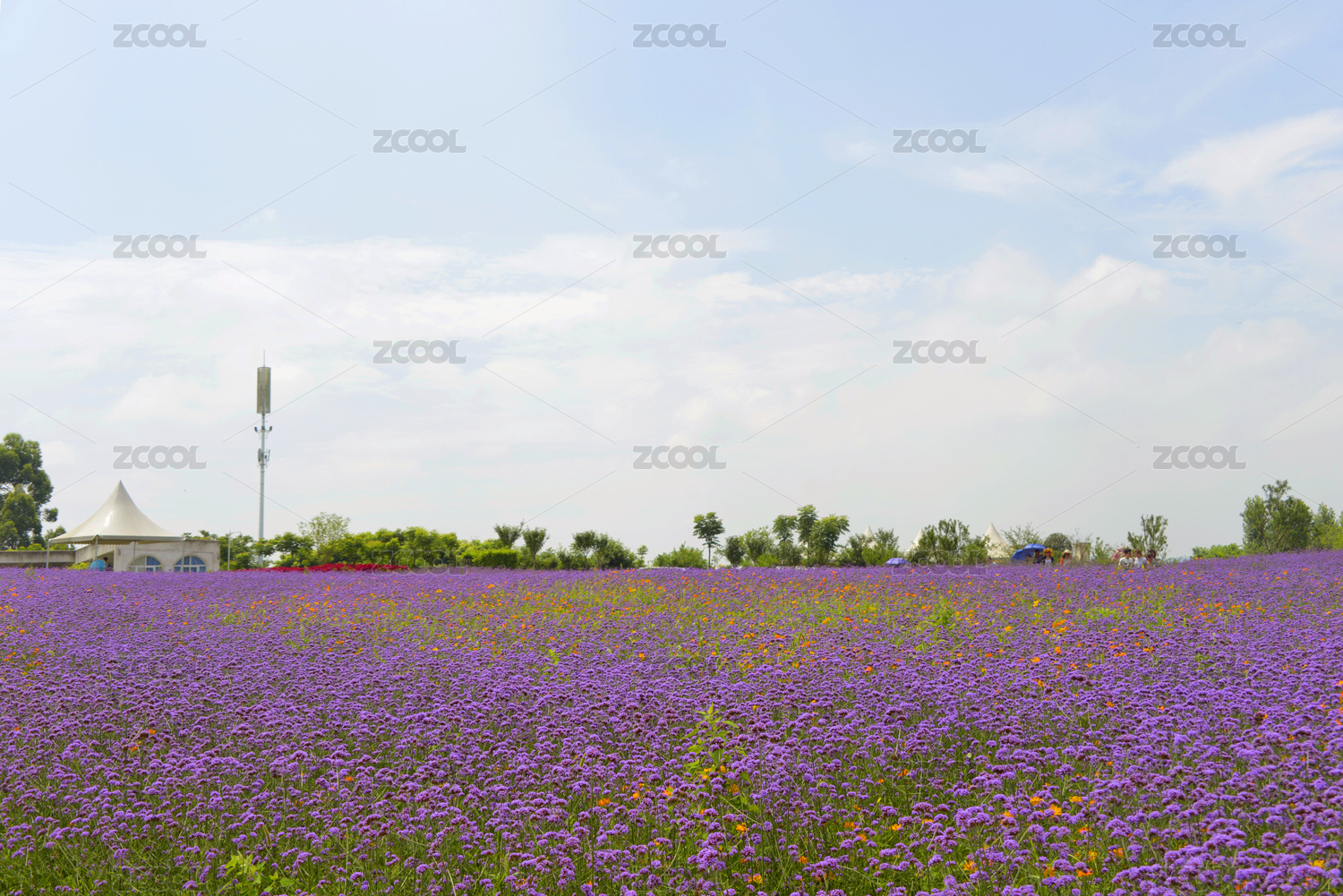 中国浙江杭州滨江公园,城市建筑与马鞭草花海