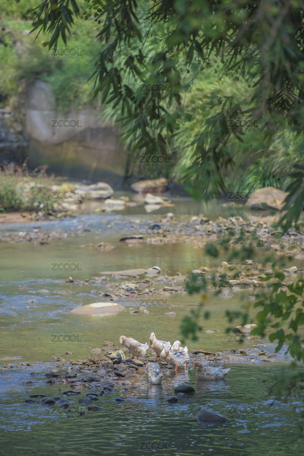 前景有竹子的河道中几只水鸭在嬉戏