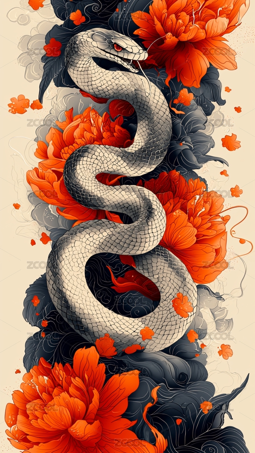 中国风,国潮风,蛇,蛇年,生肖蛇,白蛇,花