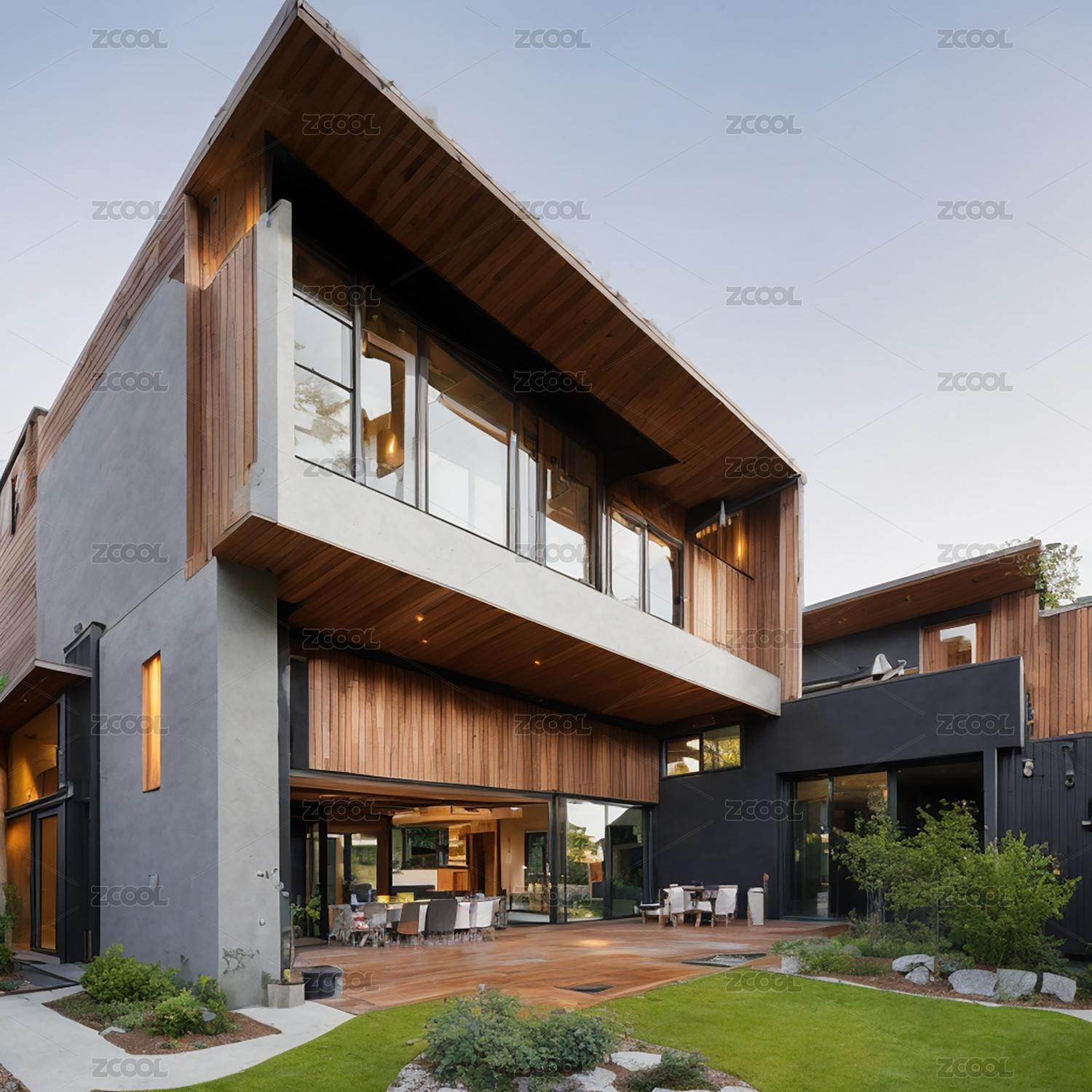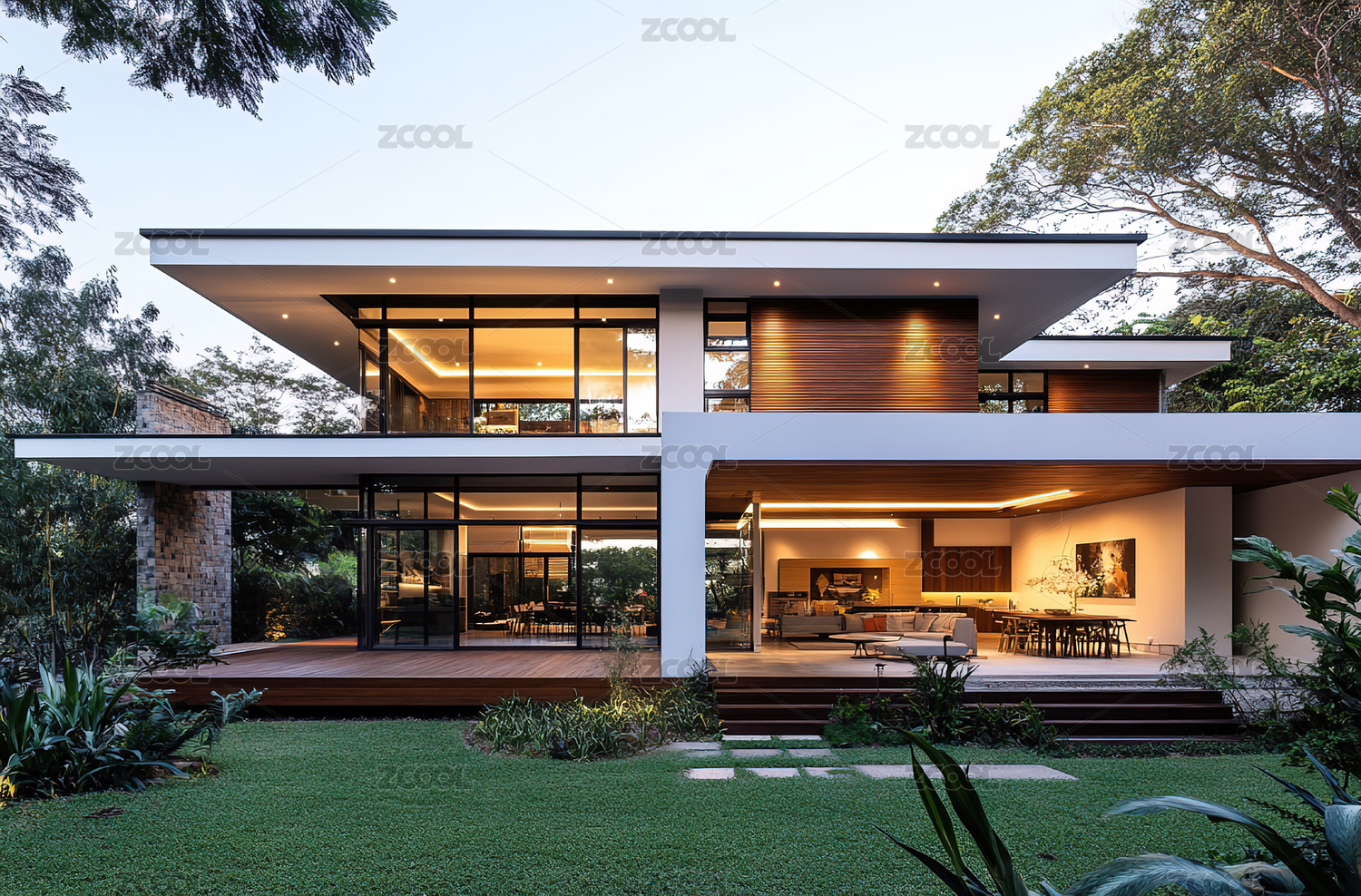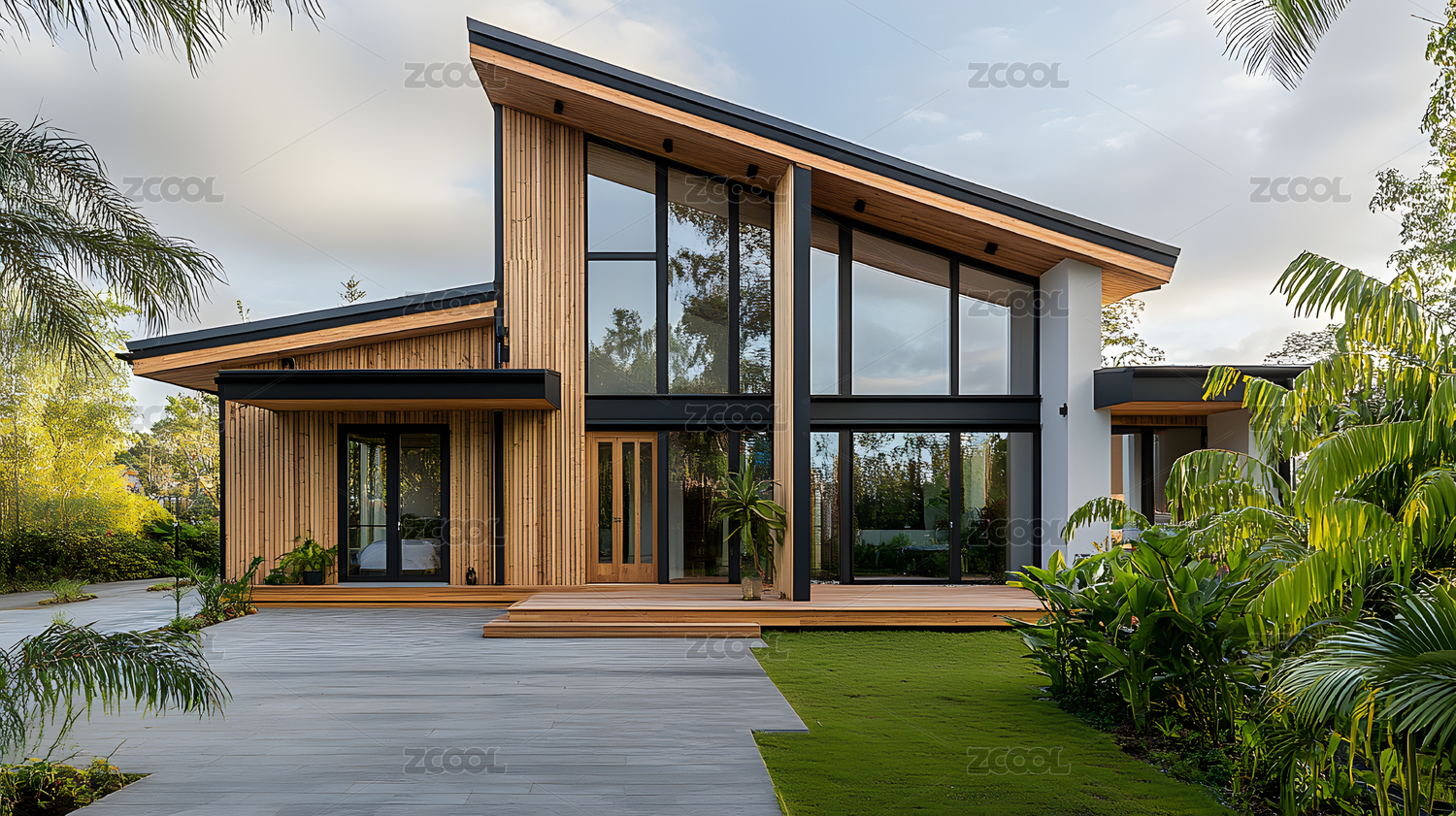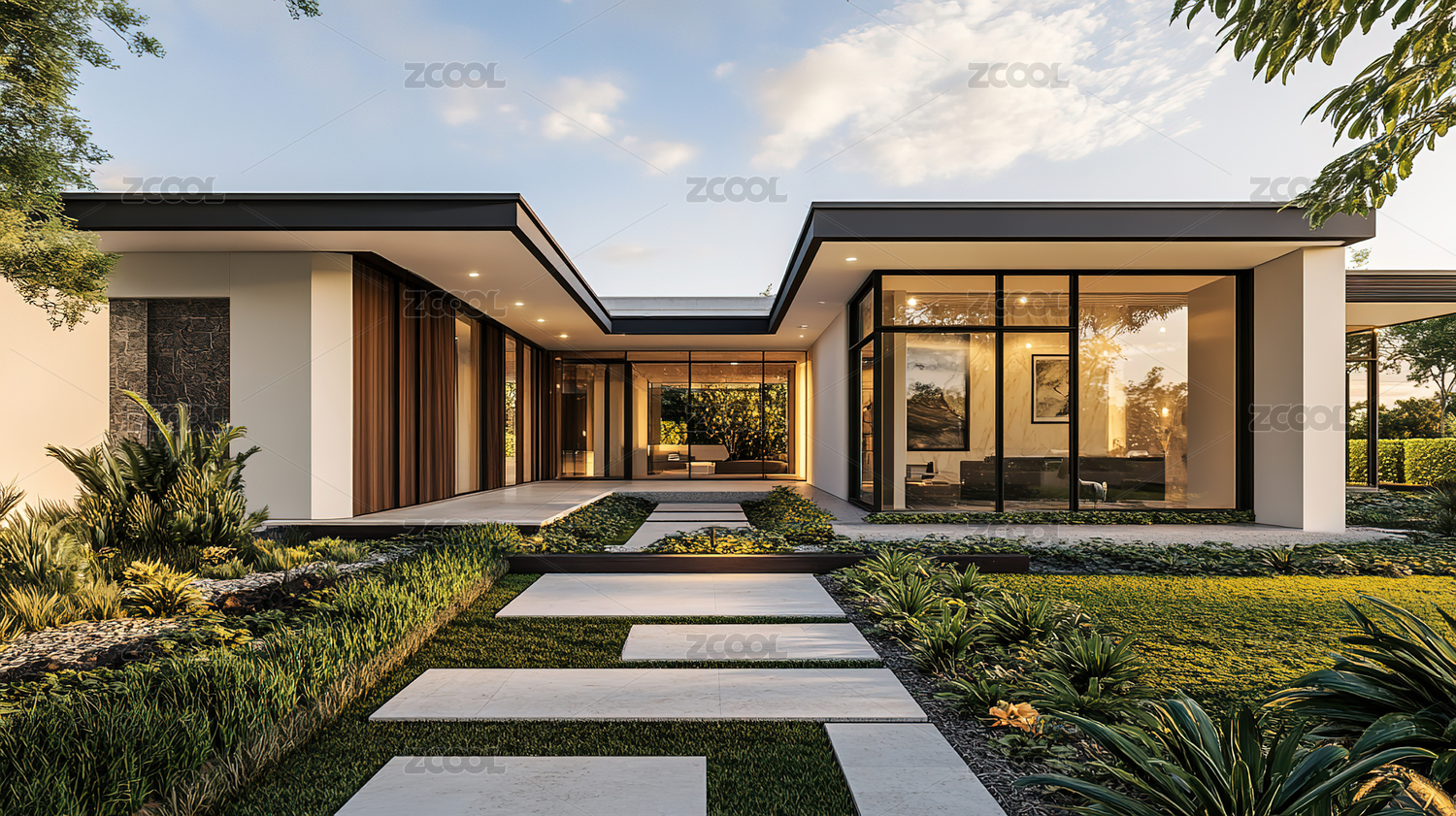 玻璃窗现代风格的绿色住宅
