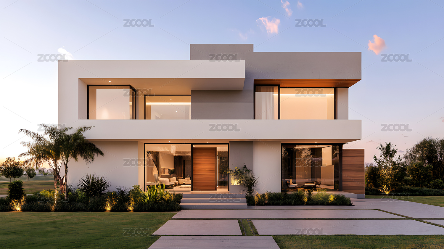现代简约别墅正面视角有干净明亮的天空背景