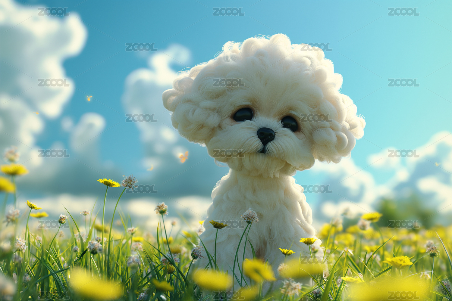 草地上一只可爱的3D卡通宠物狗