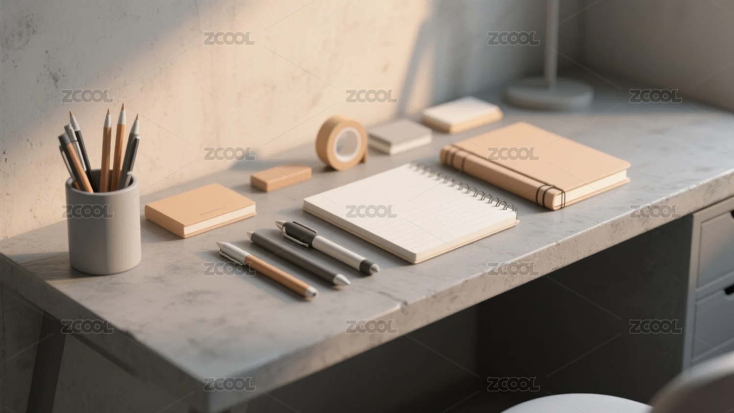 简洁书桌上的文具与笔记本
