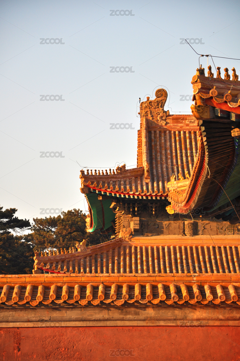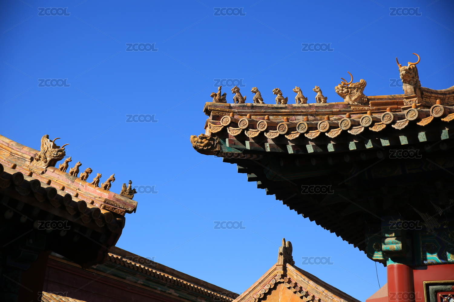 蓝天下的北京中山公园宰牲亭屋顶房檐特写