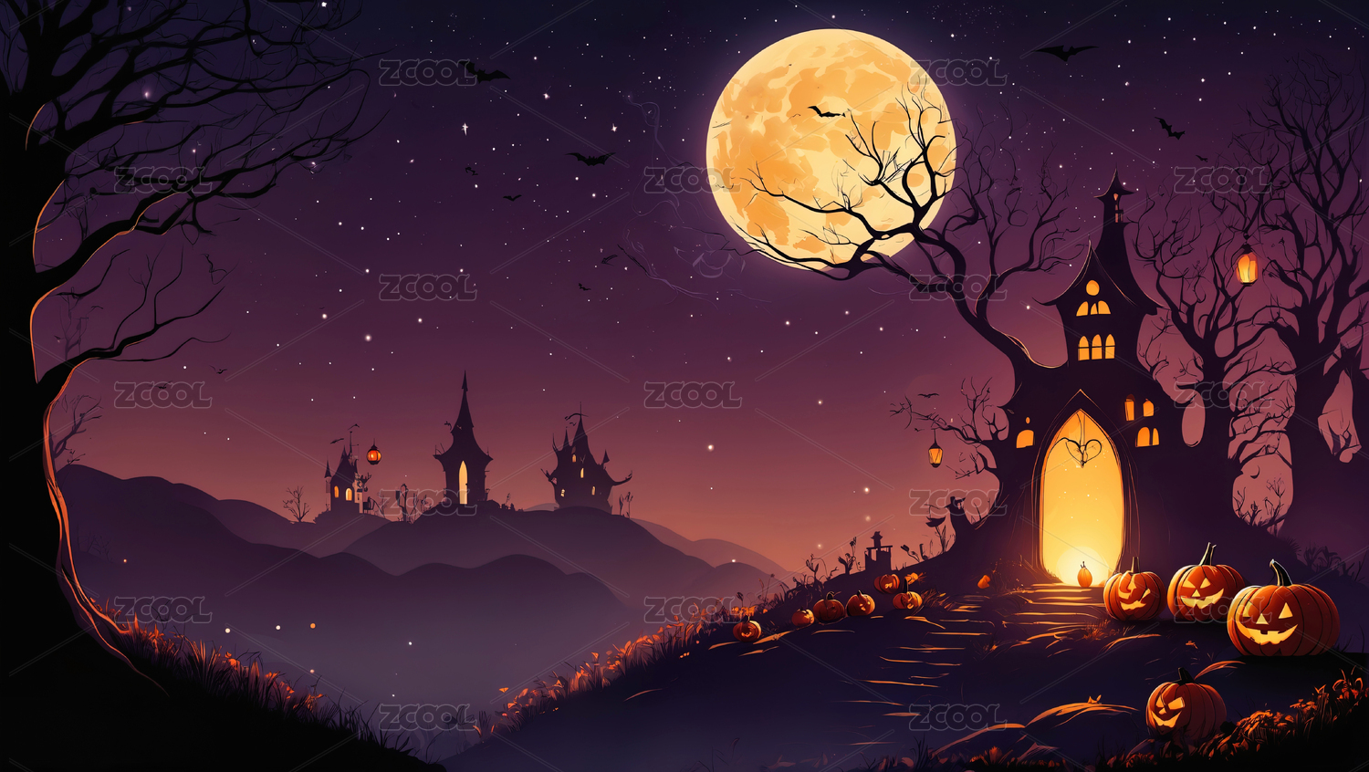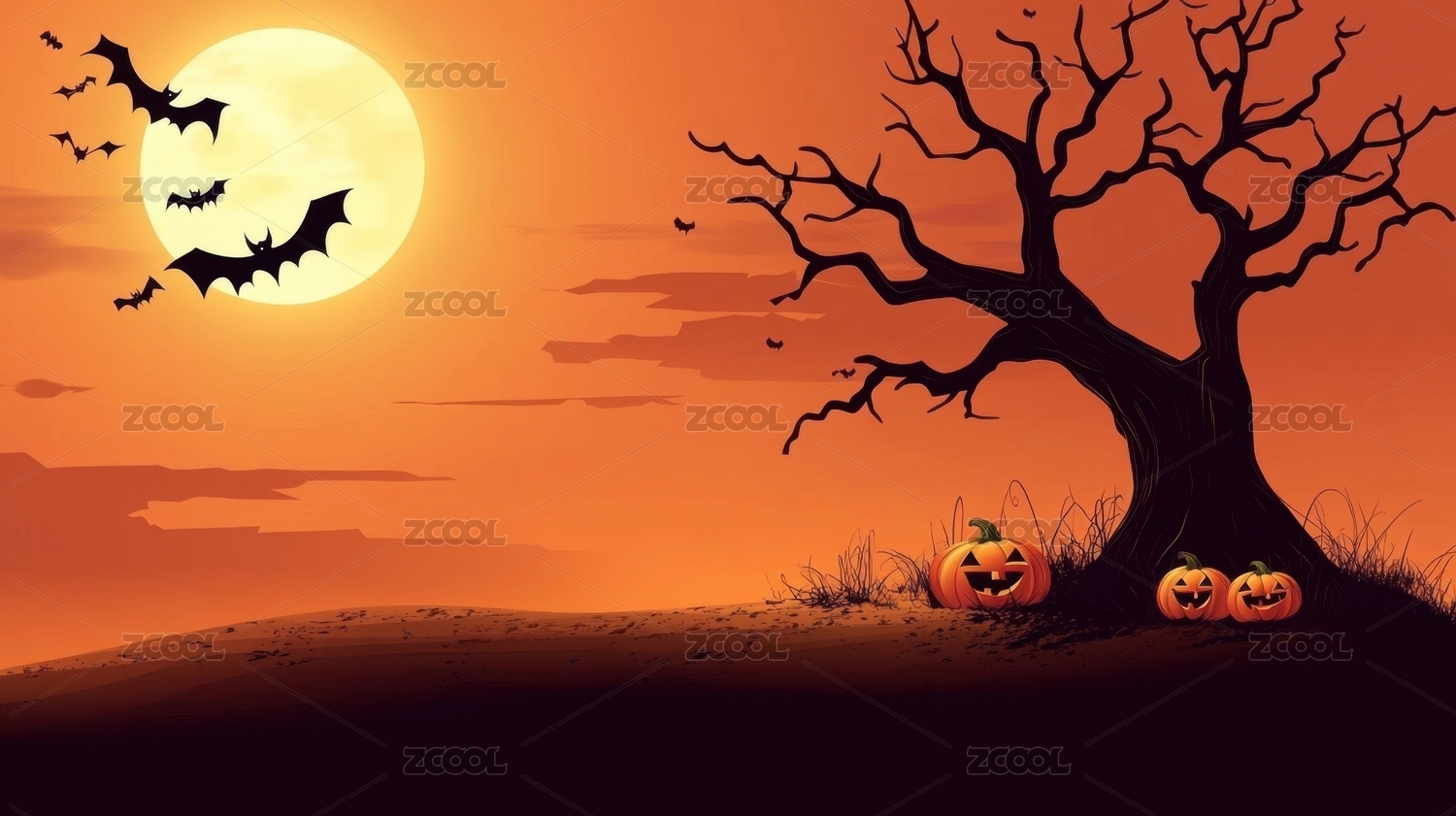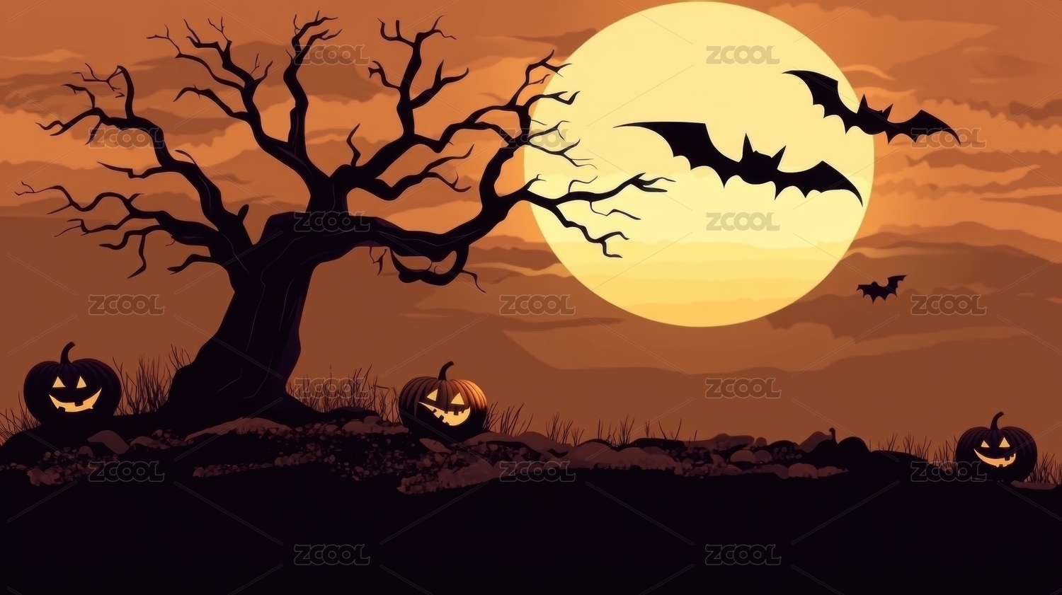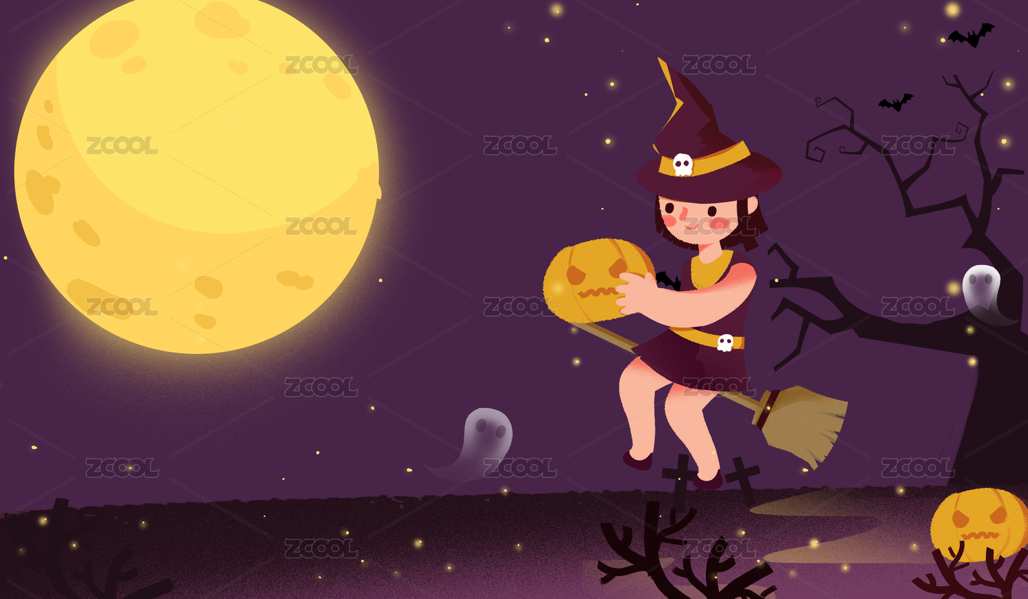卡通手绘万圣节扁平插画 横版 底图 背景