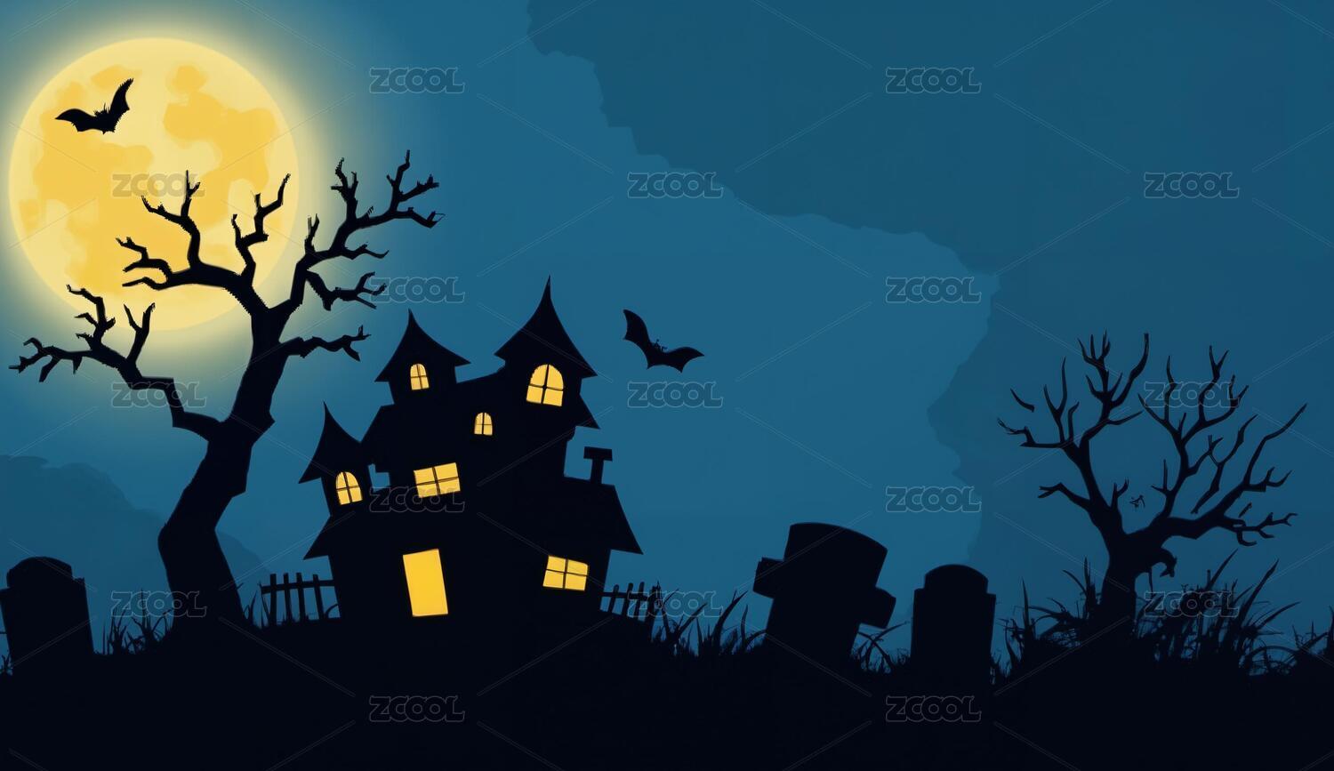 卡通手绘万圣节蓝色夜晚背景素材扁平插画