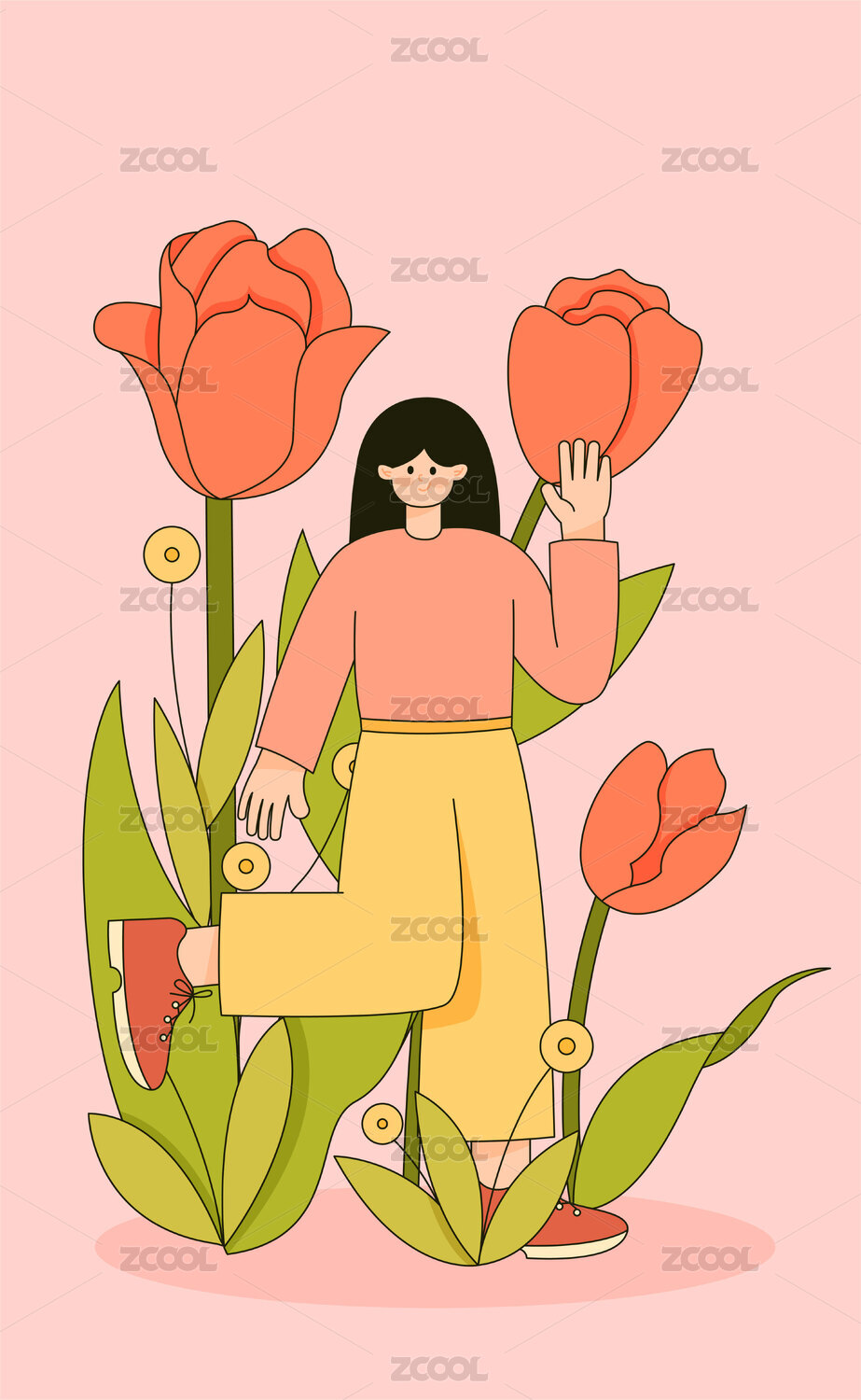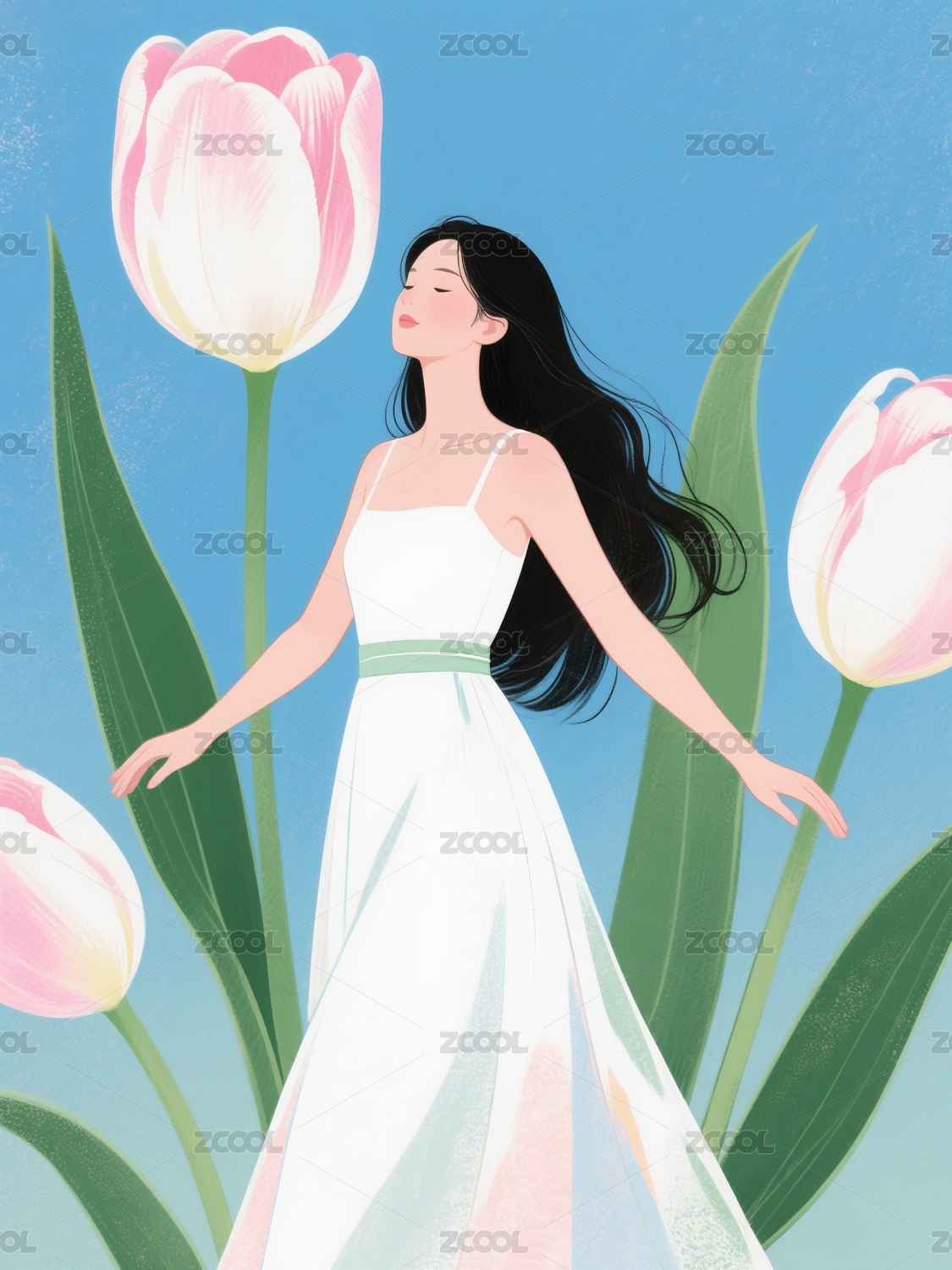 郁金香和女生节日插画