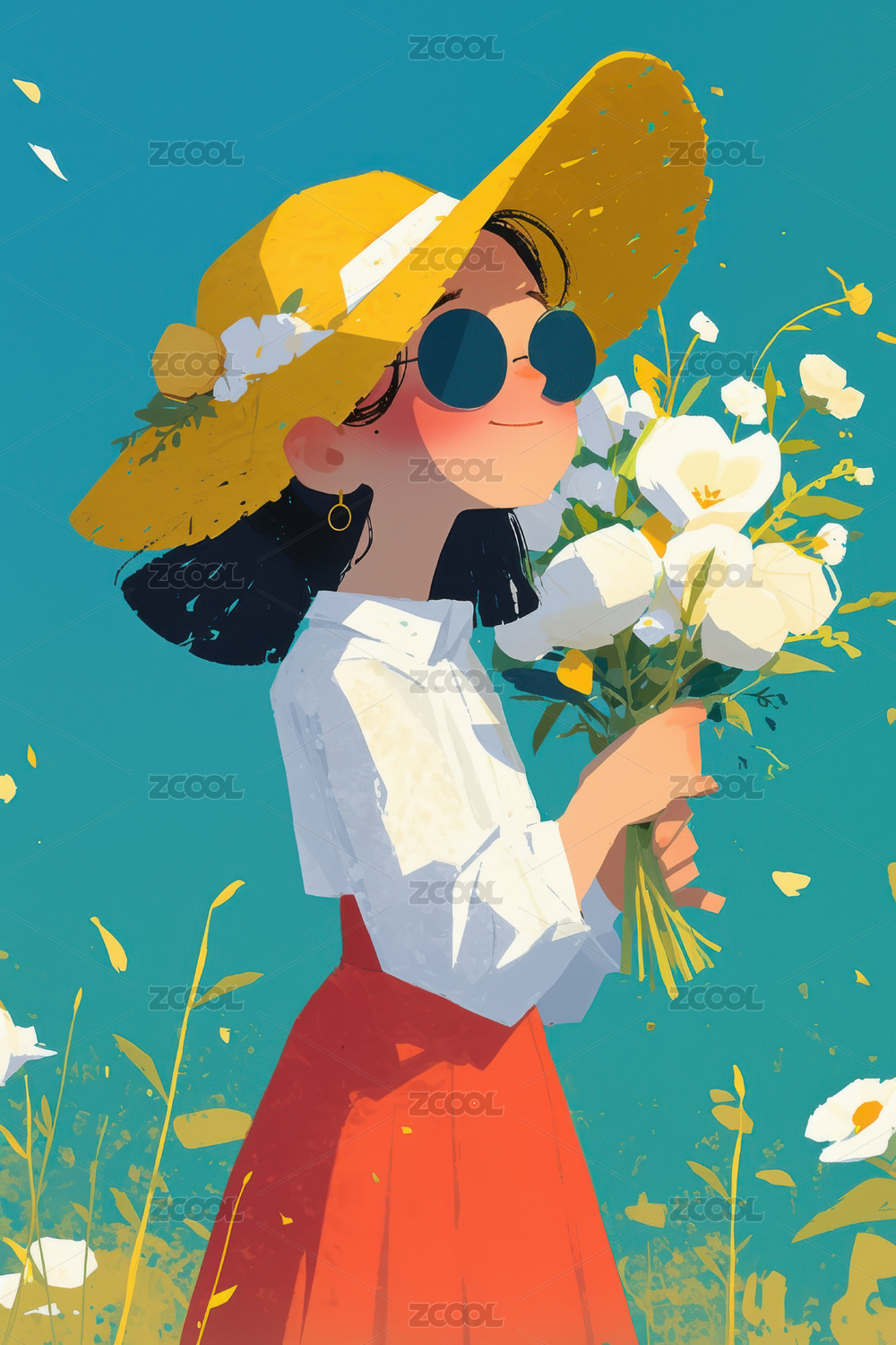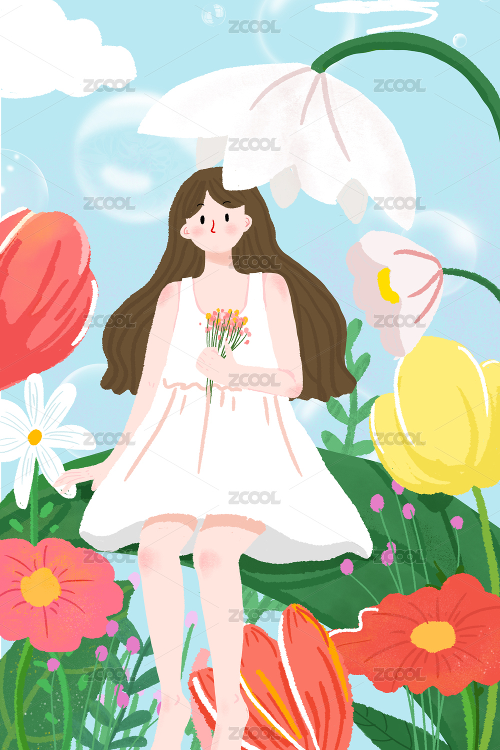 春季花海与女孩插画