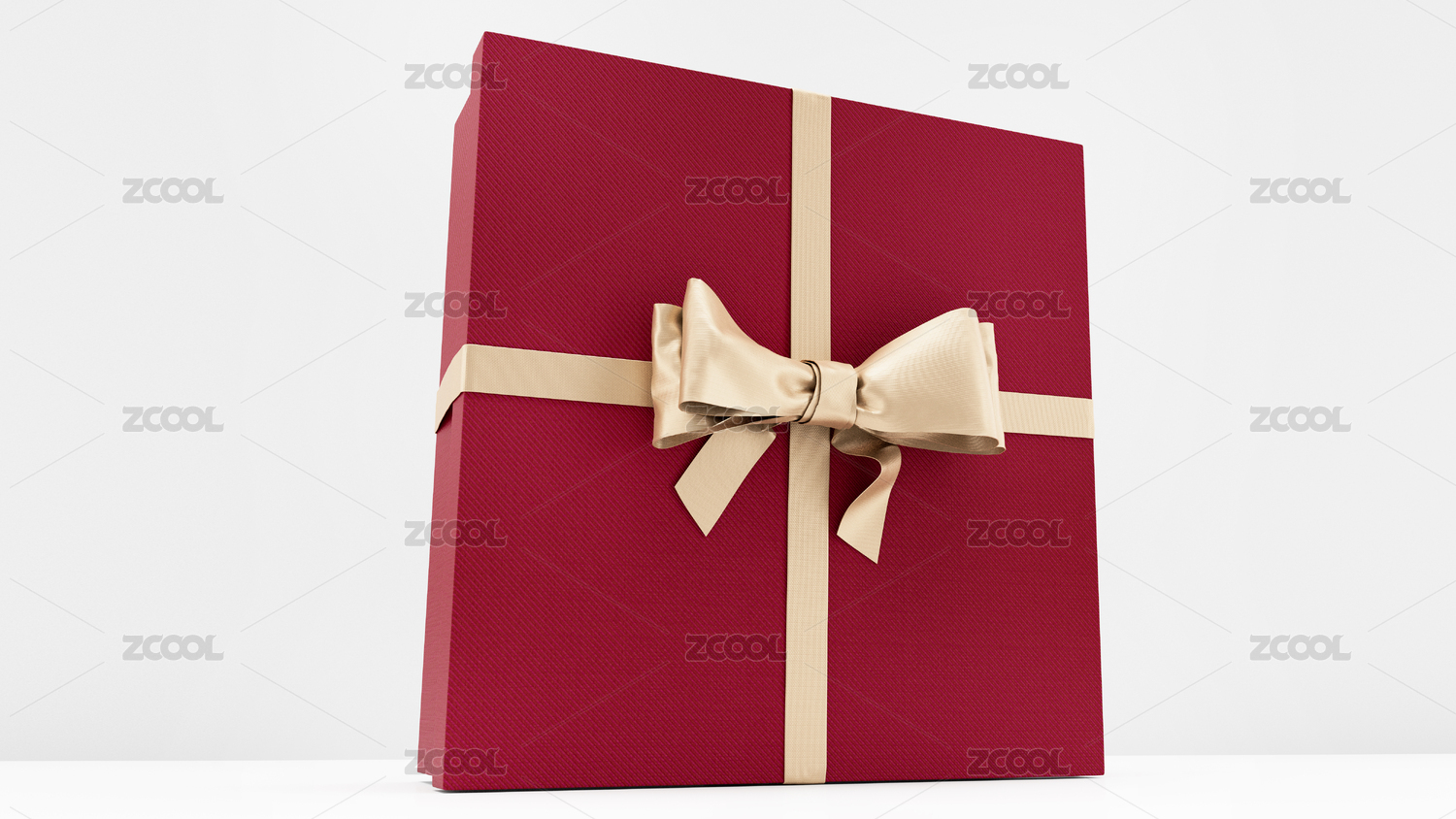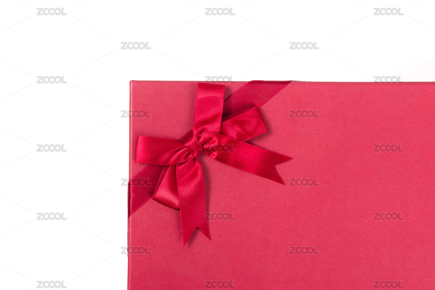 平放在红色背景的绑着香槟色带子的礼品盒局部
