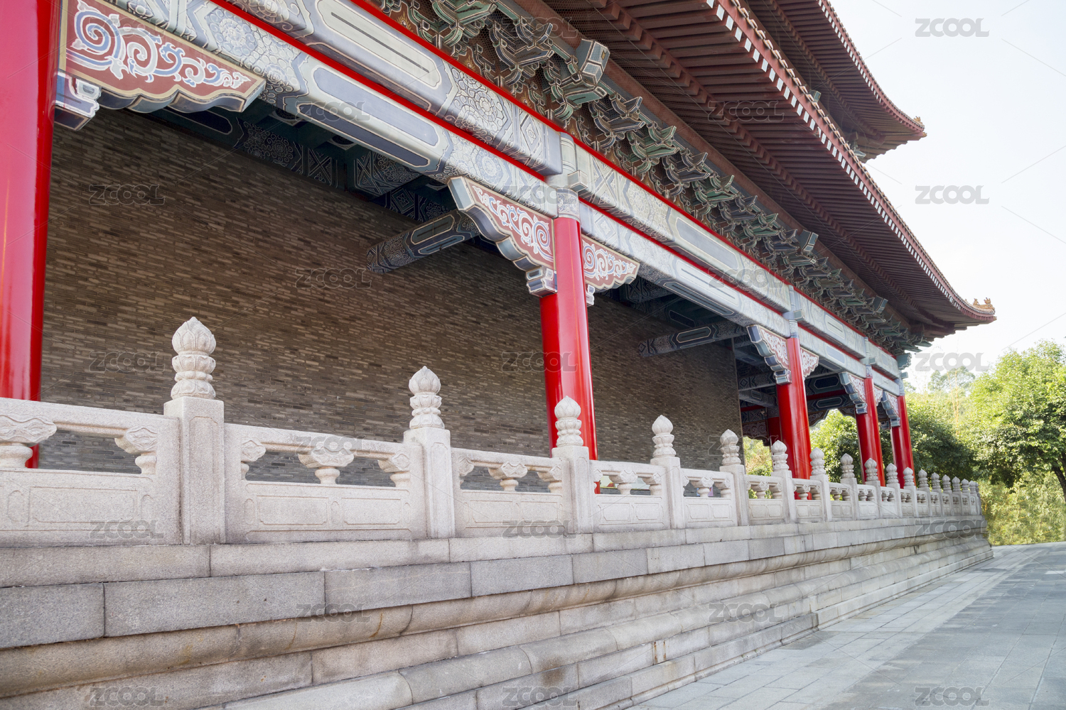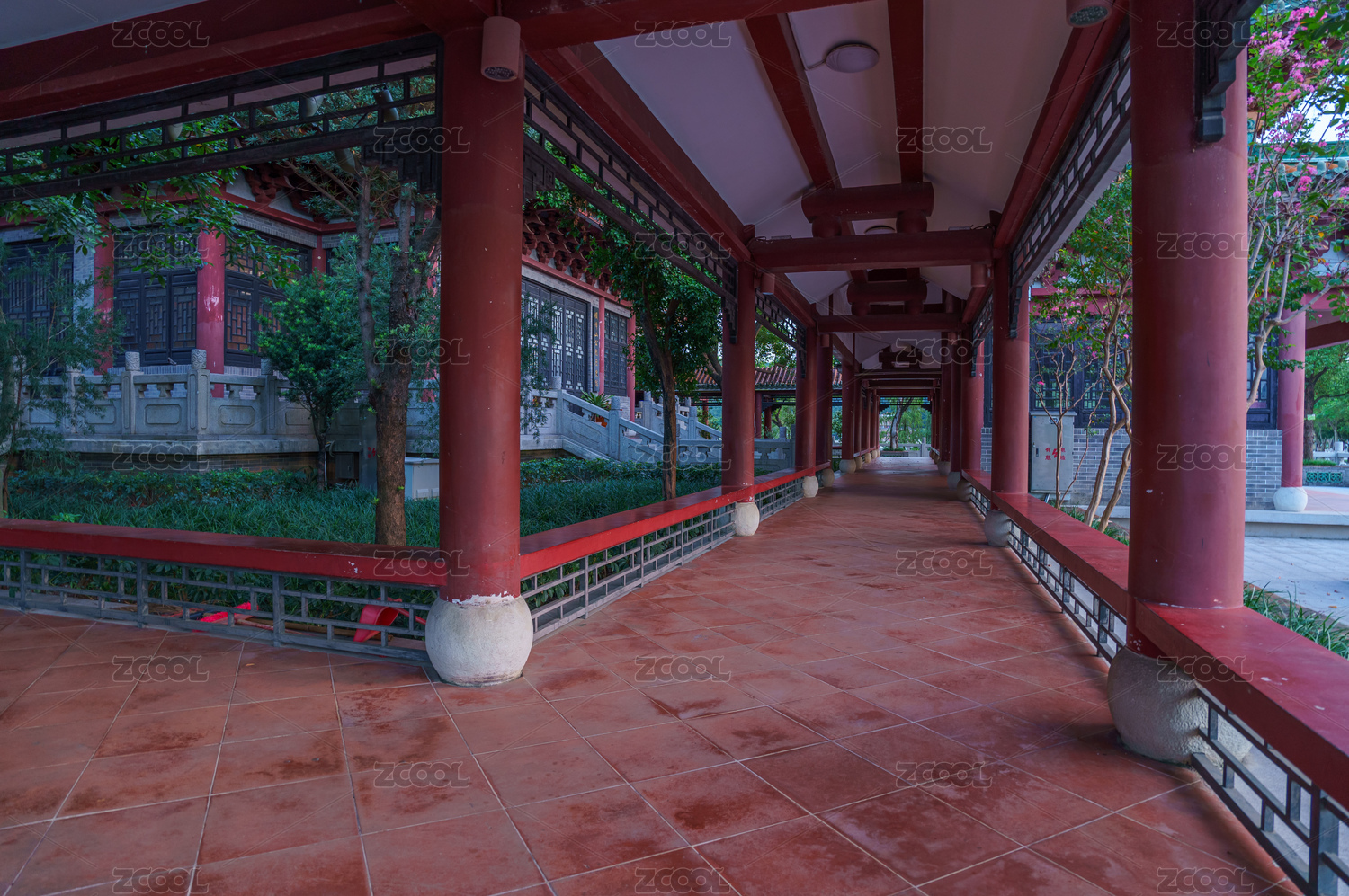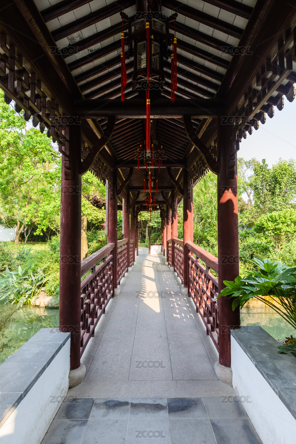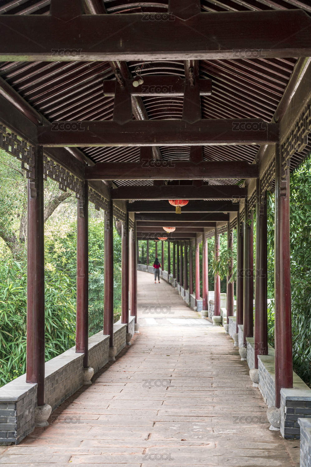中国古建筑长廊的房顶、脊、坡、柱和额枋正面图
