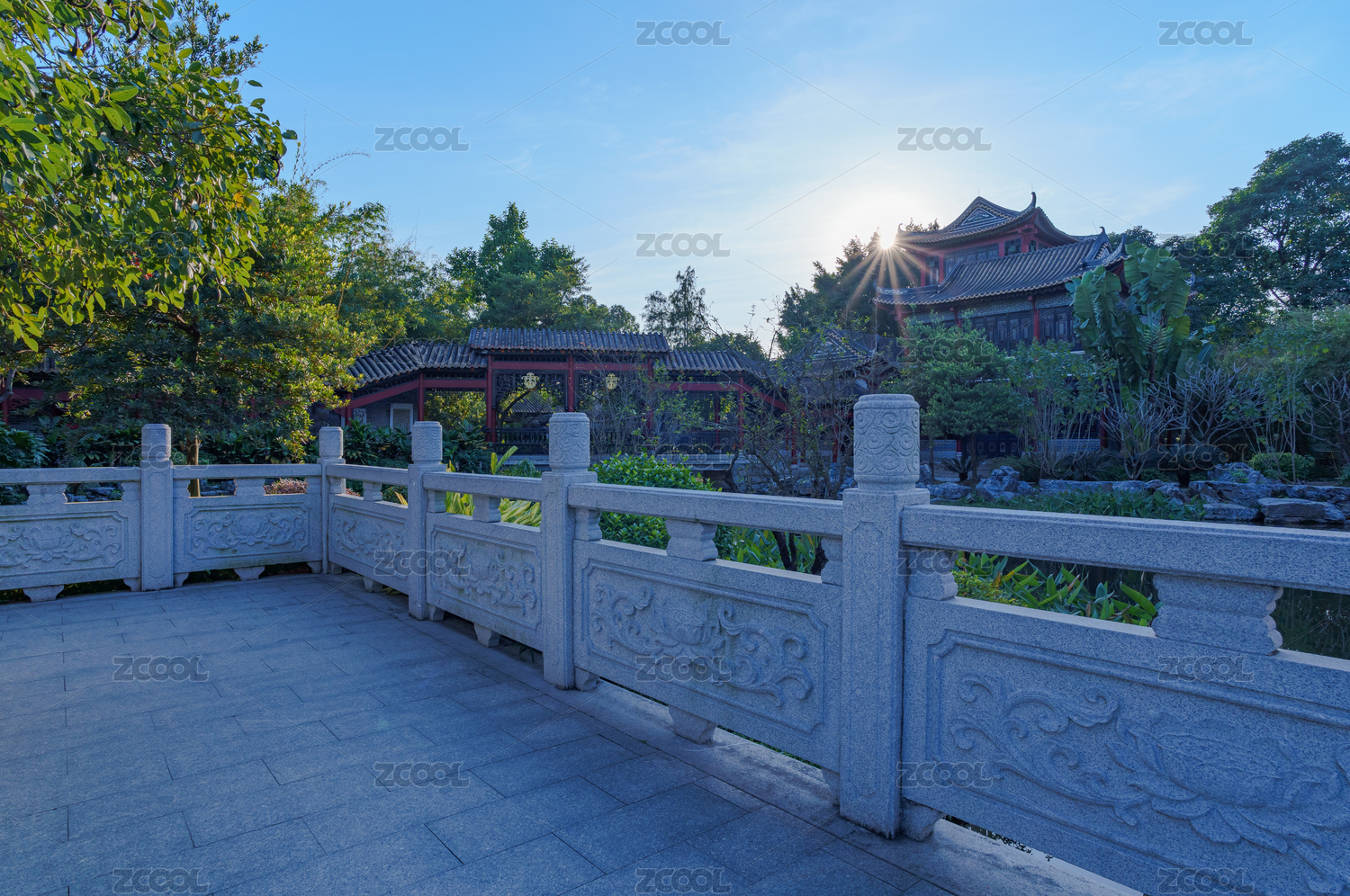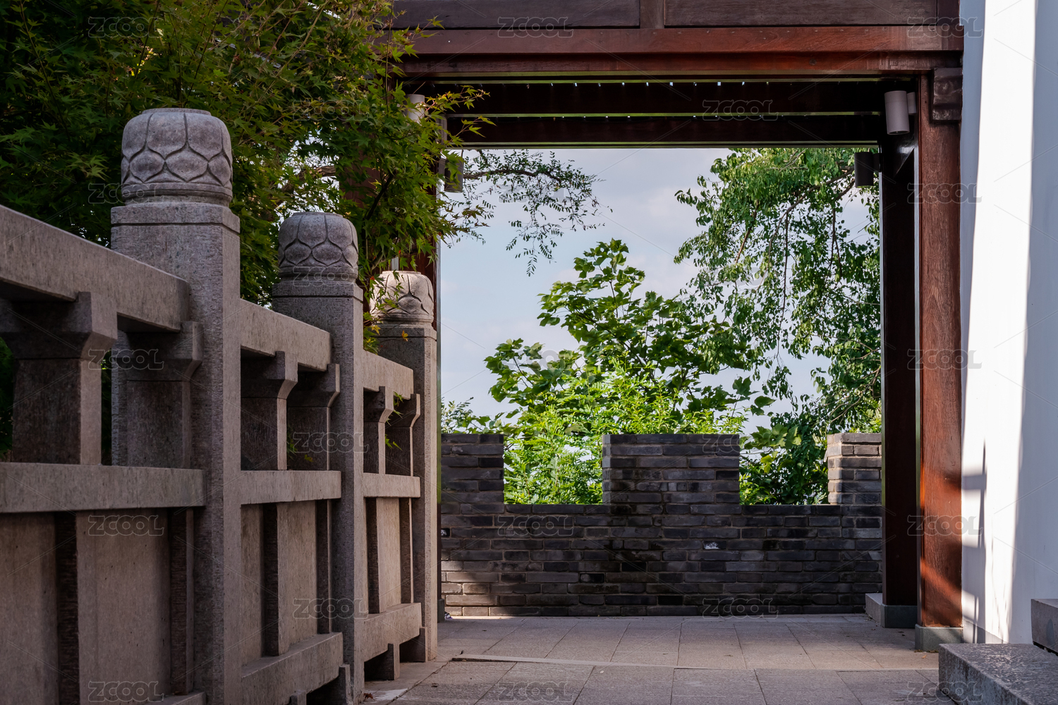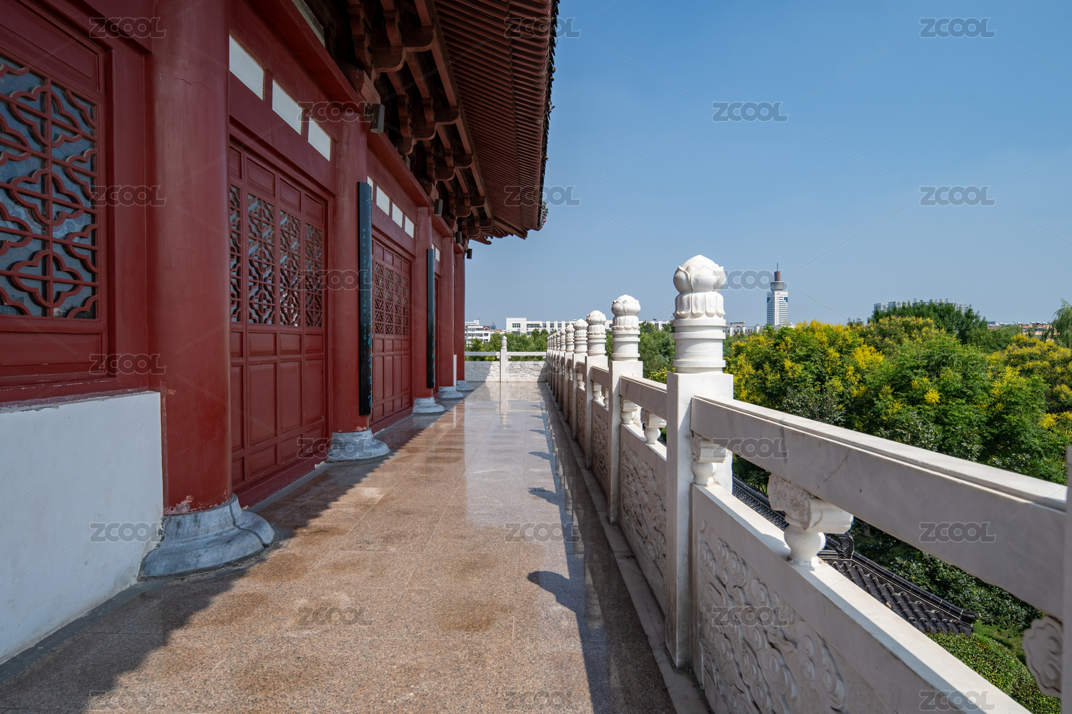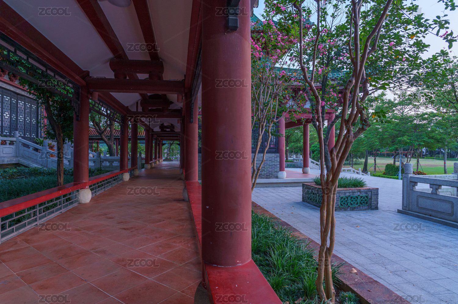 中国古建筑长廊的房顶、脊、坡、柱和额枋正面图