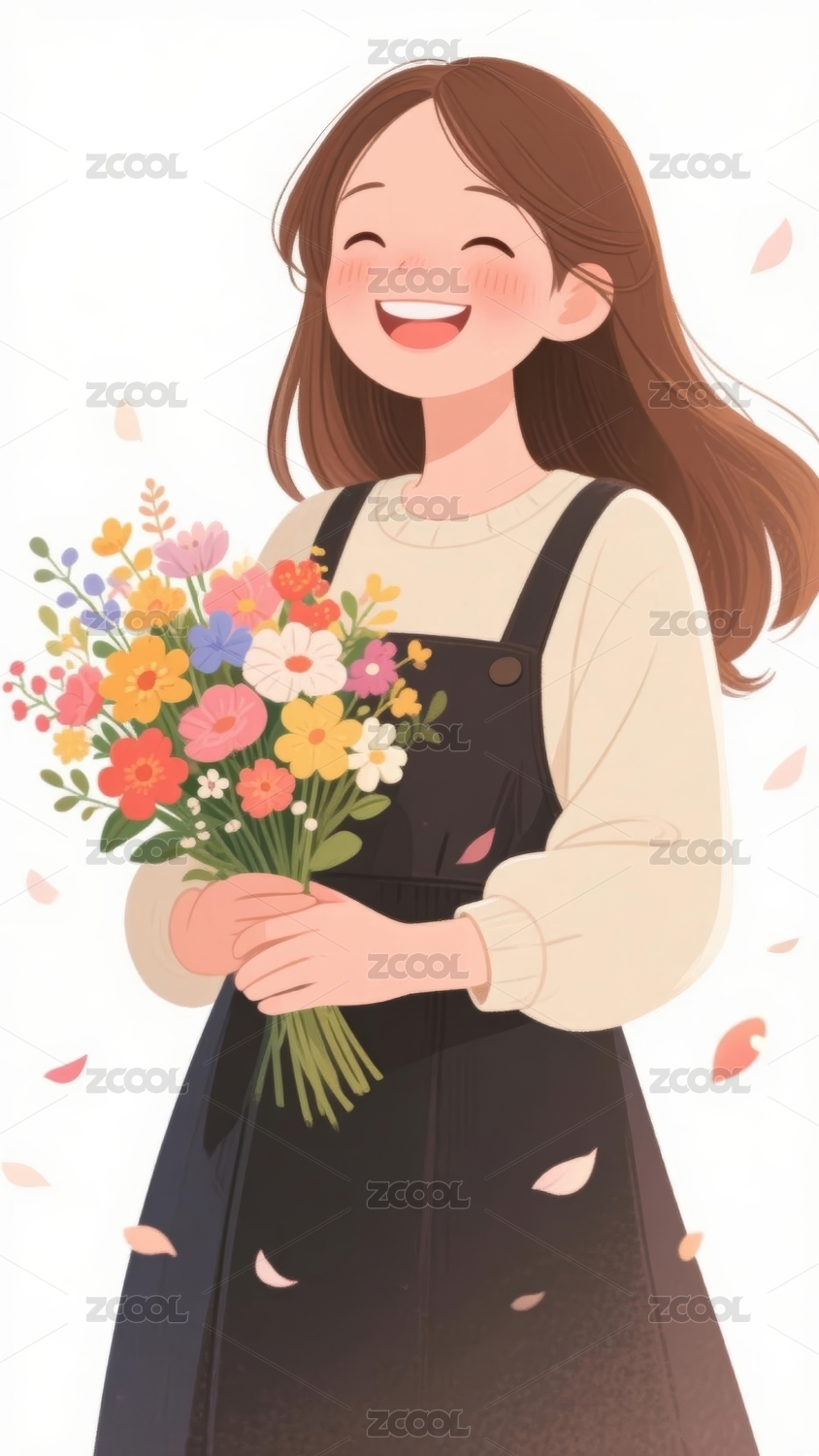 女生手捧鲜花插画,感恩节教师节母亲节概念