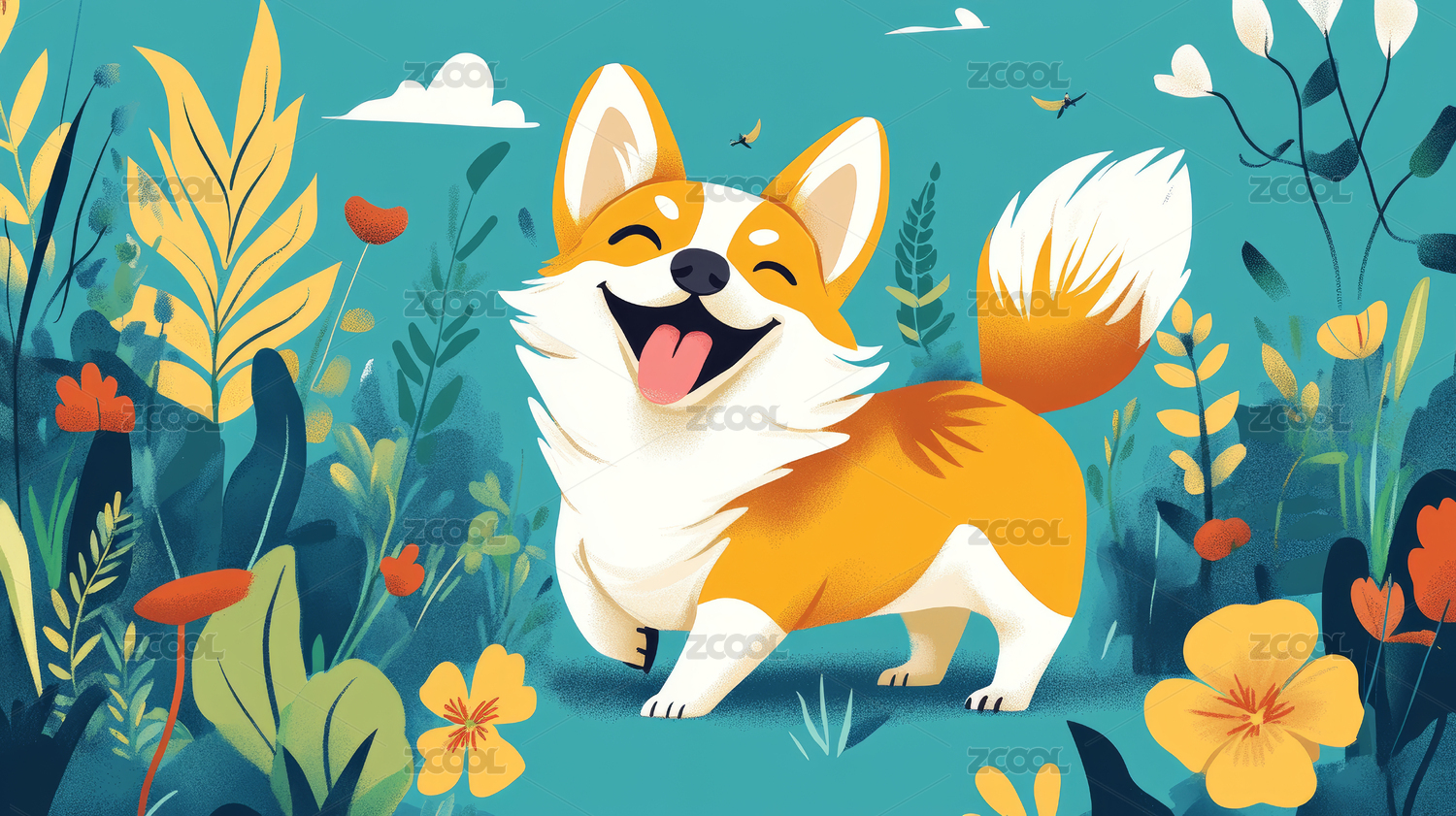 花丛中的小狗插画