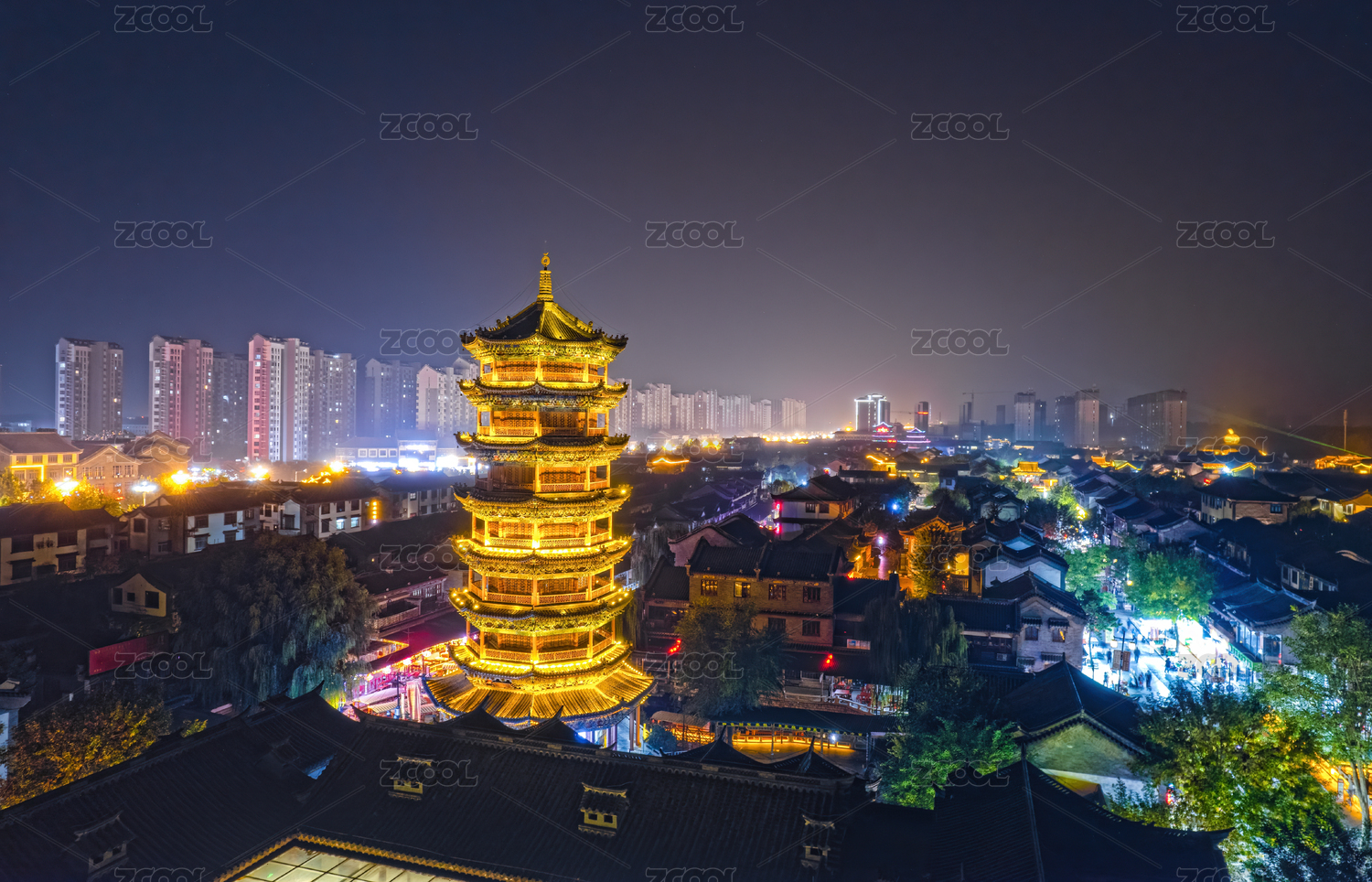 河南商丘古城雪景夜景航拍