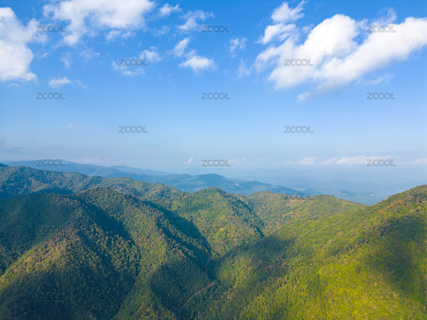 航拍蓝天白云下的绿色山脉自然风光