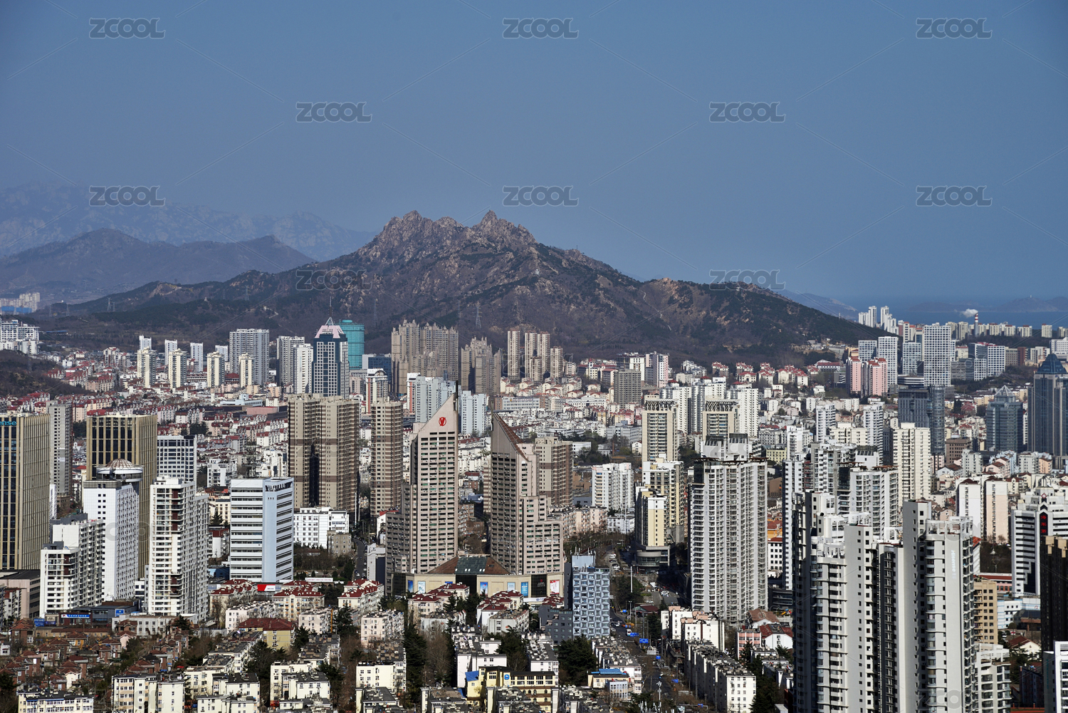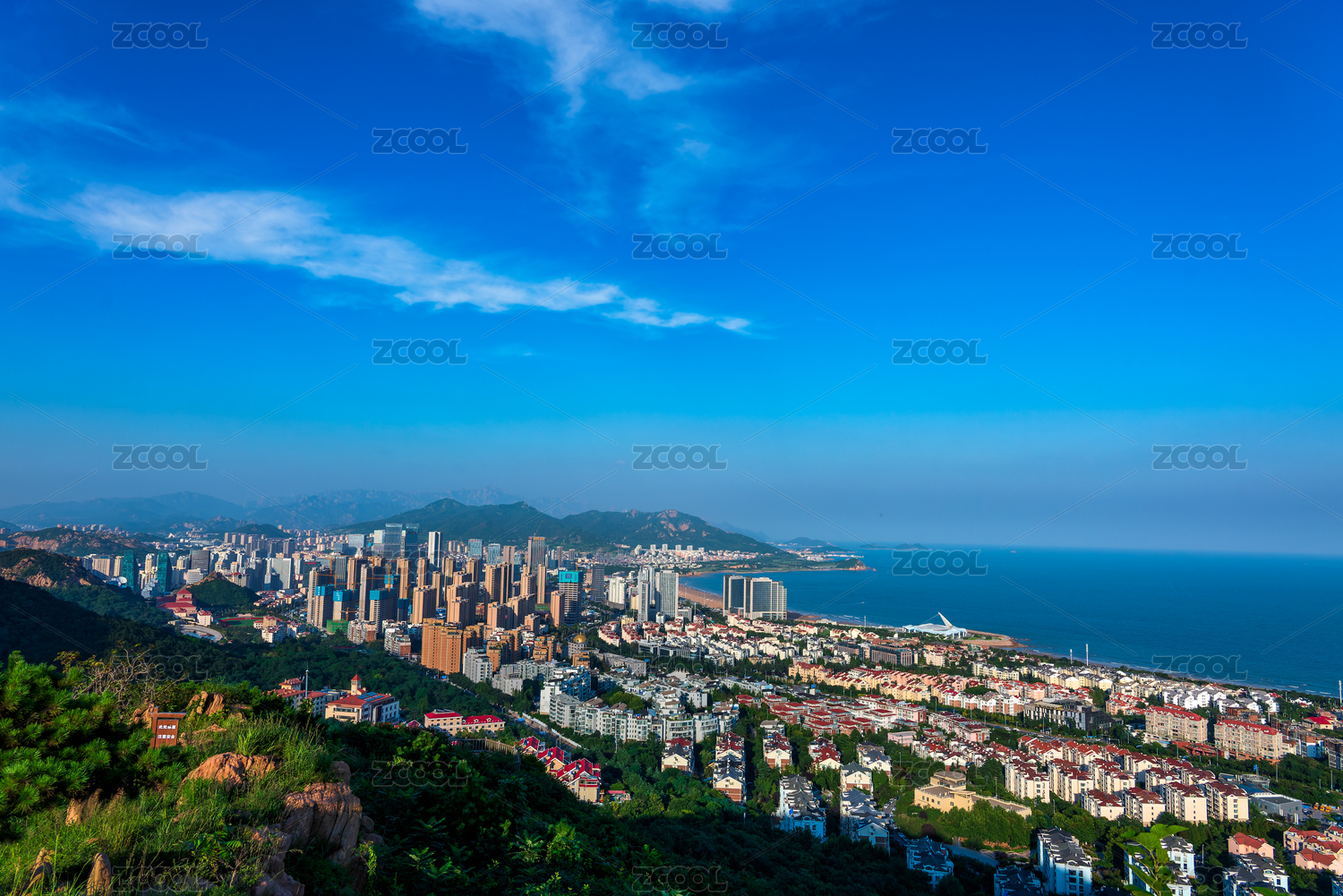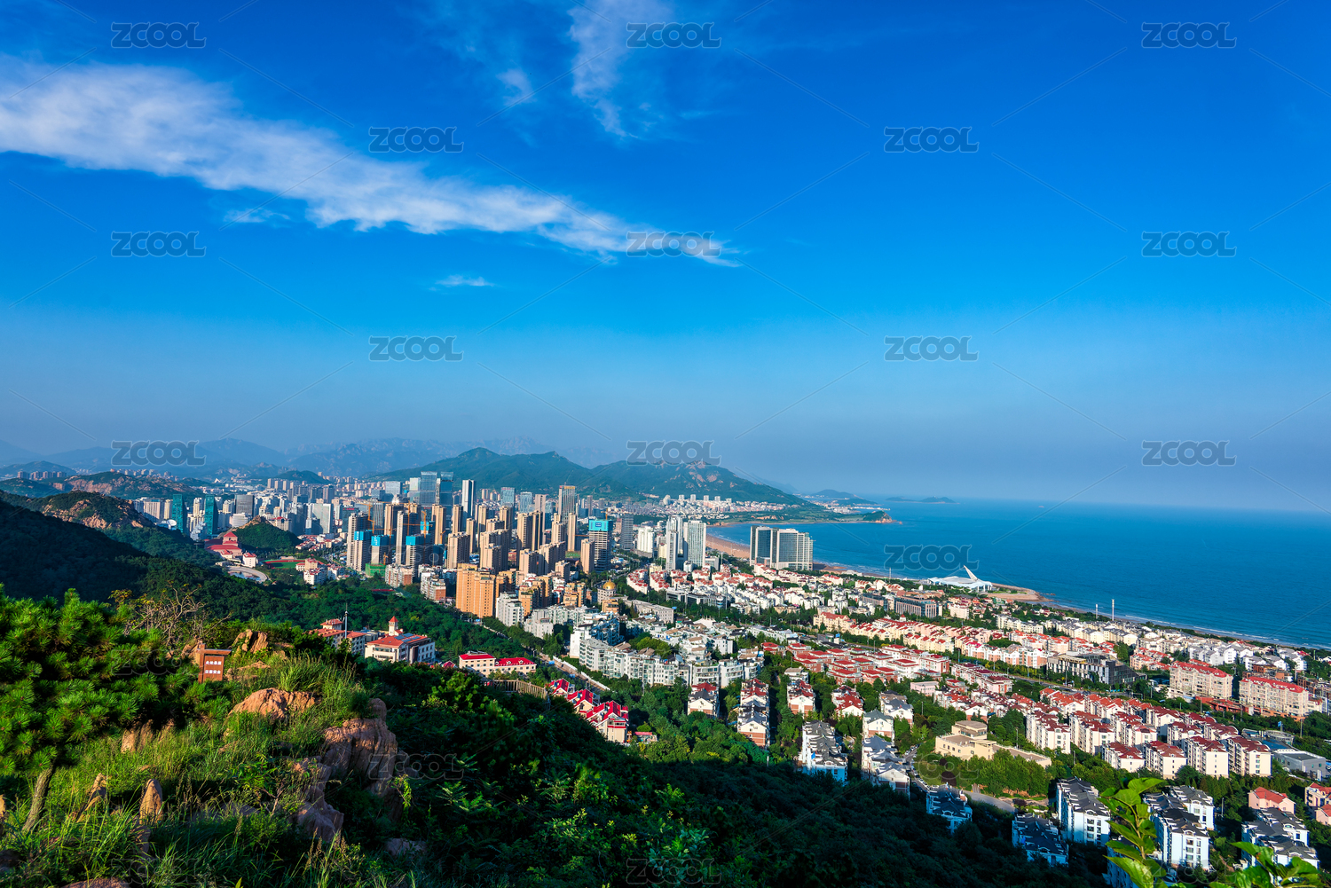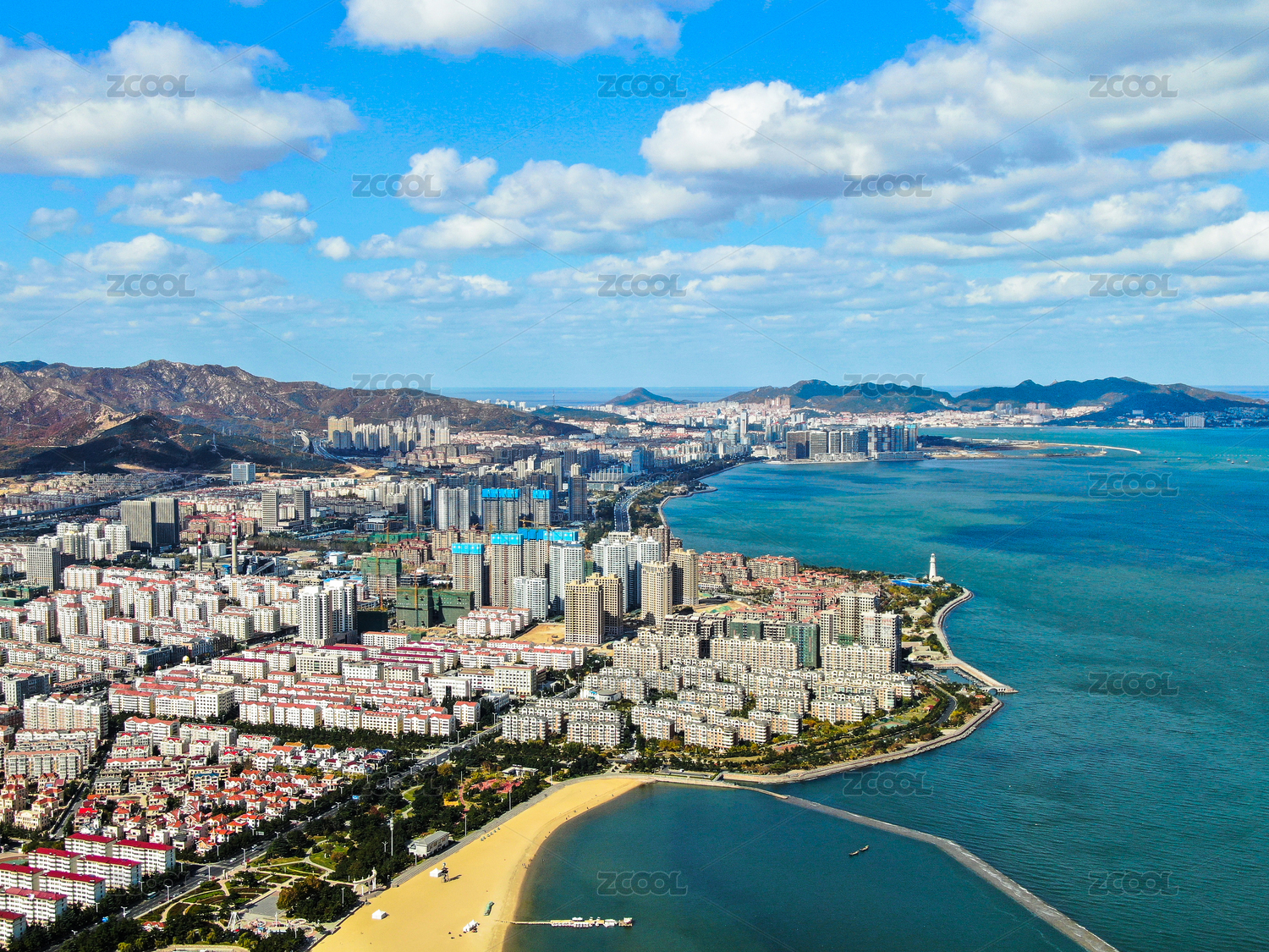 航拍山东烟台沿海海岸线建筑群城市自然风光