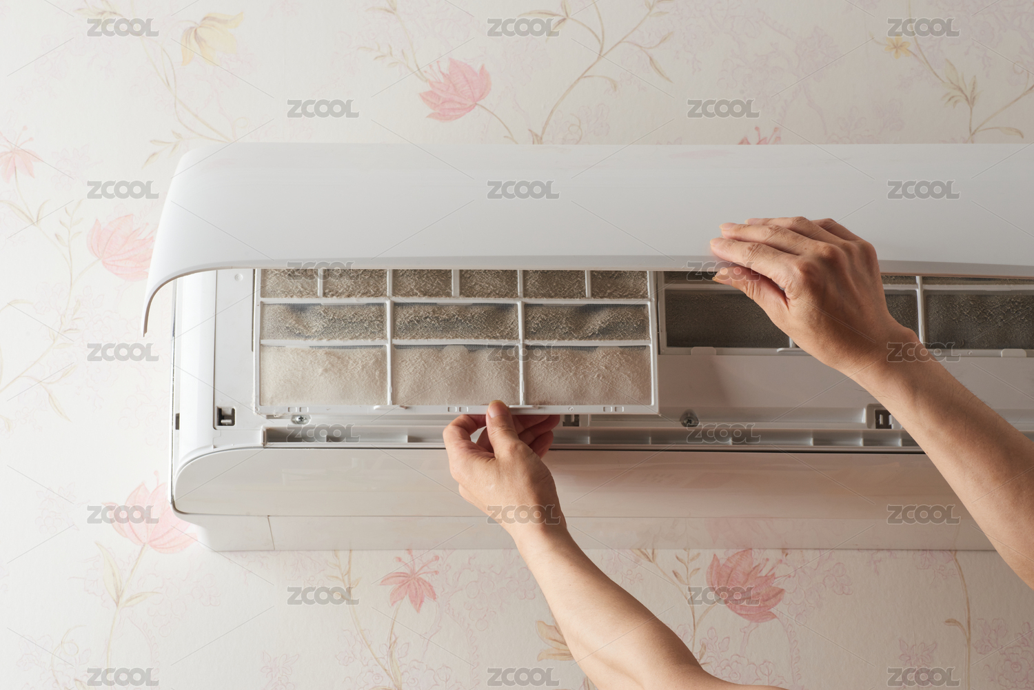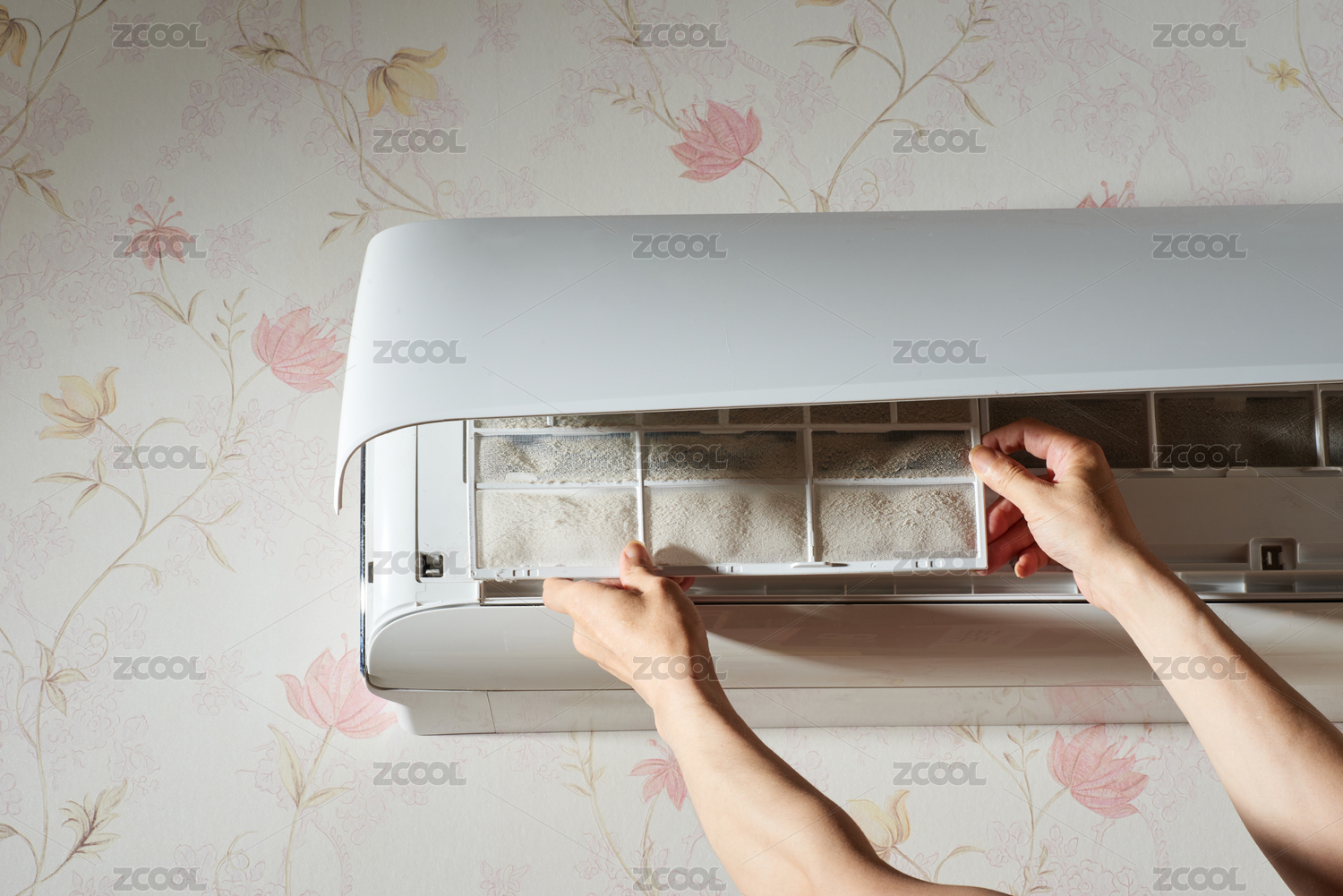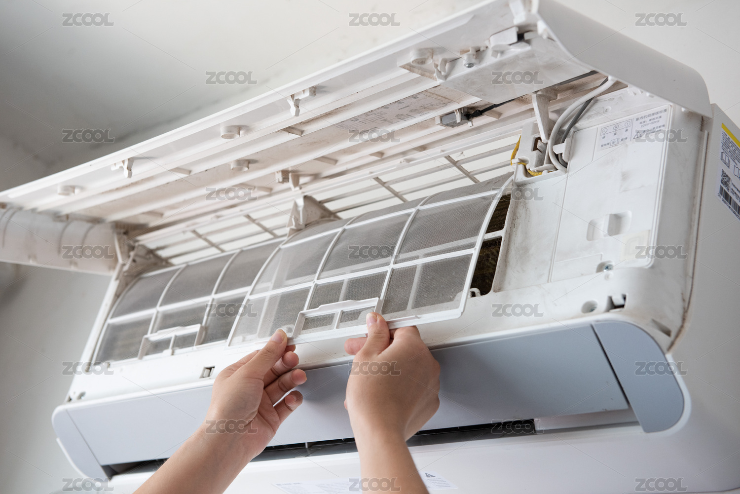 拆除家用空调沾满灰尘的过滤网