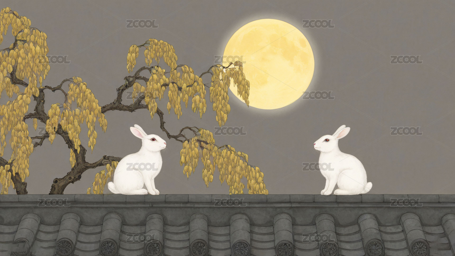 中秋节红色氛围屋顶上的兔子和圆月插画背景