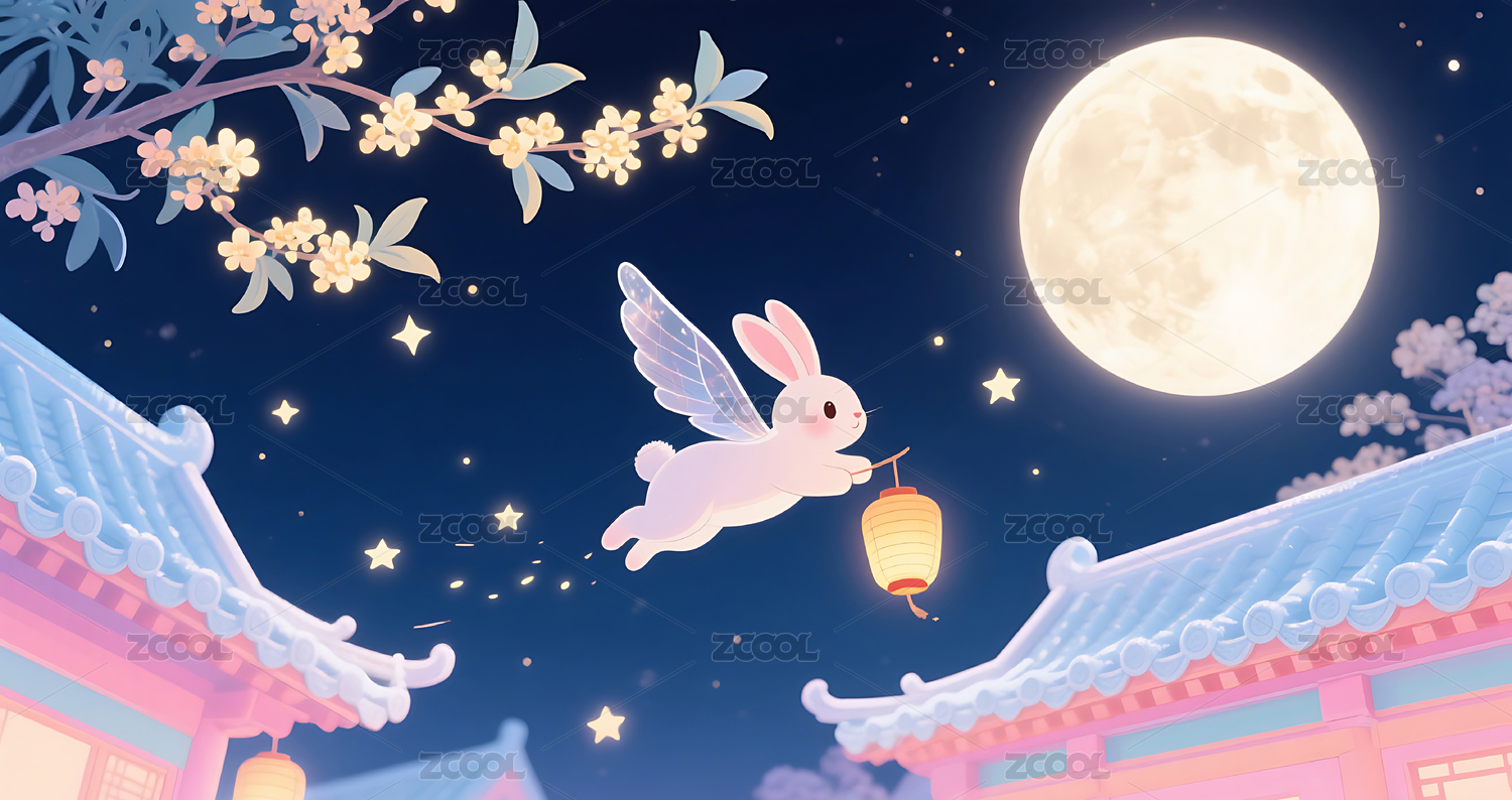 夜晚,插画,背景,壁纸,星空,月亮,兔子,可爱,中秋节,温馨