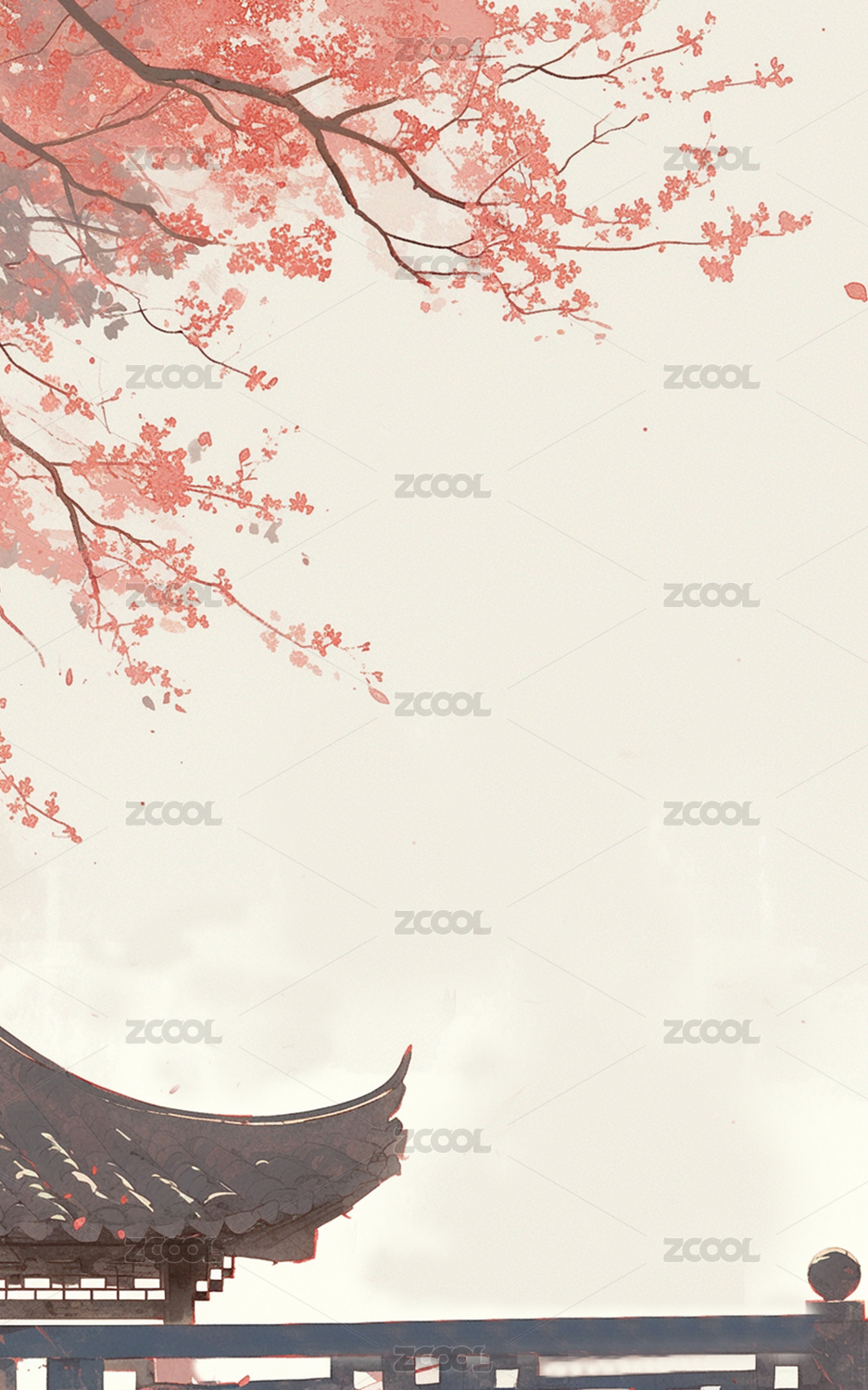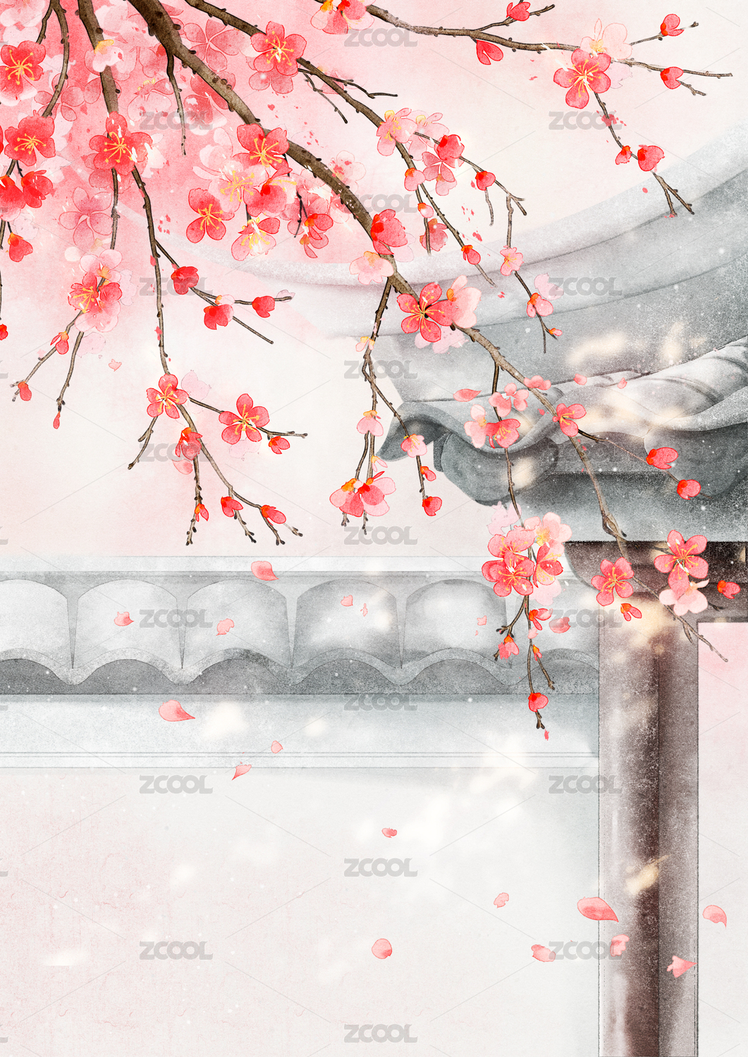 户外庭院子梅花樱花植物树木门框走廊栏杆