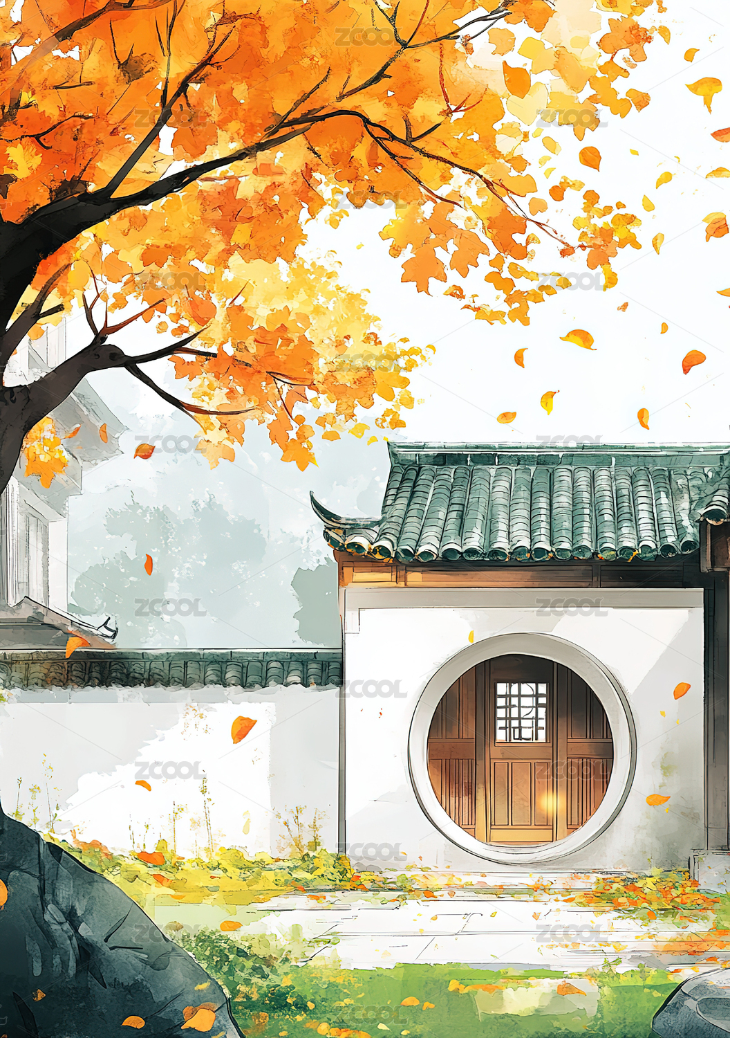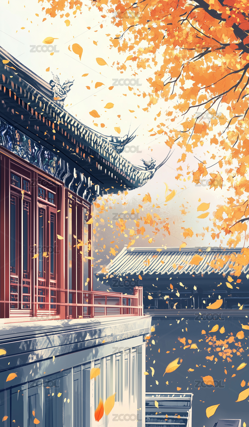 秋天飘落枫树枫叶古风中式古典镂空建筑走廊