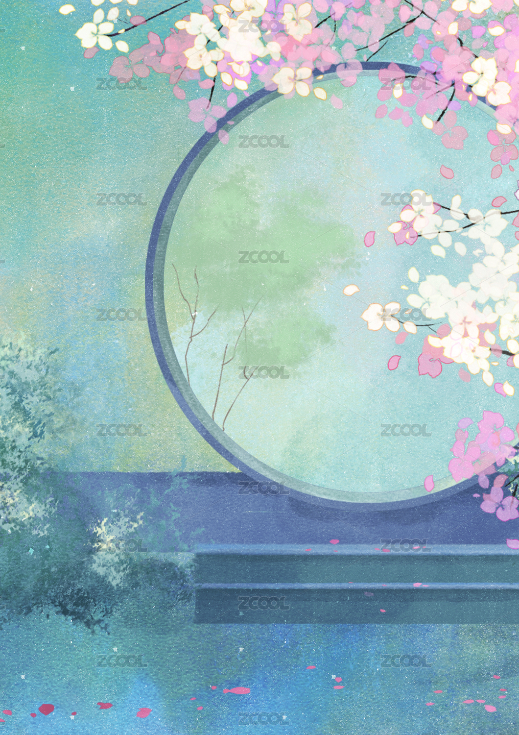传统文化白天晴朗有花的墙面花格窗插画绘画