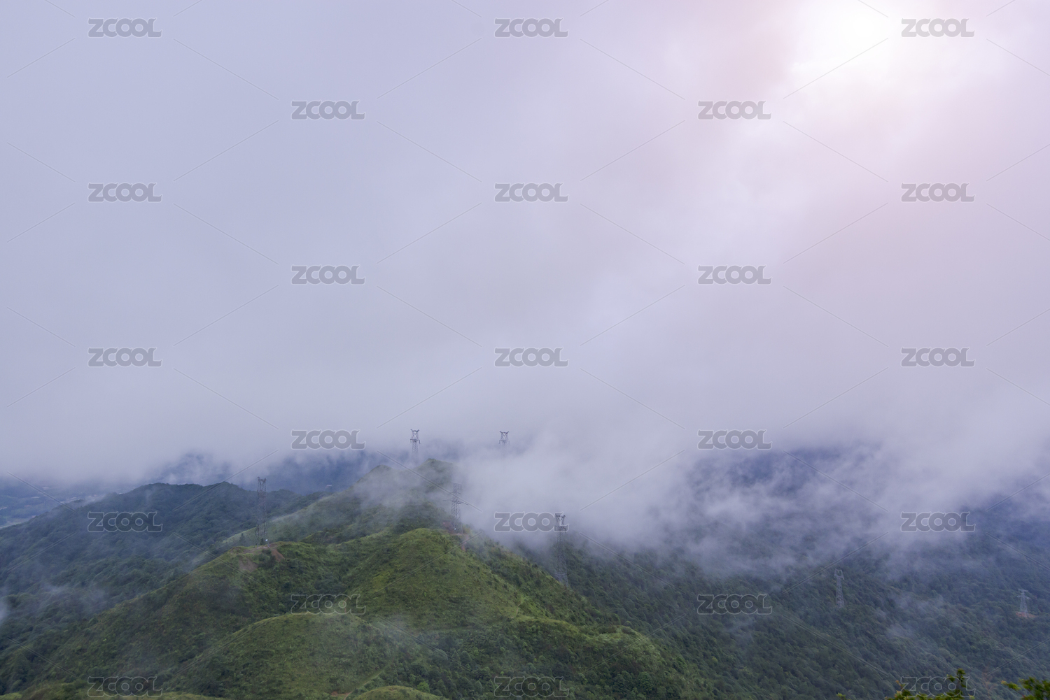 矗立着高压电线塔的山顶雾气弥漫,福建龙岩