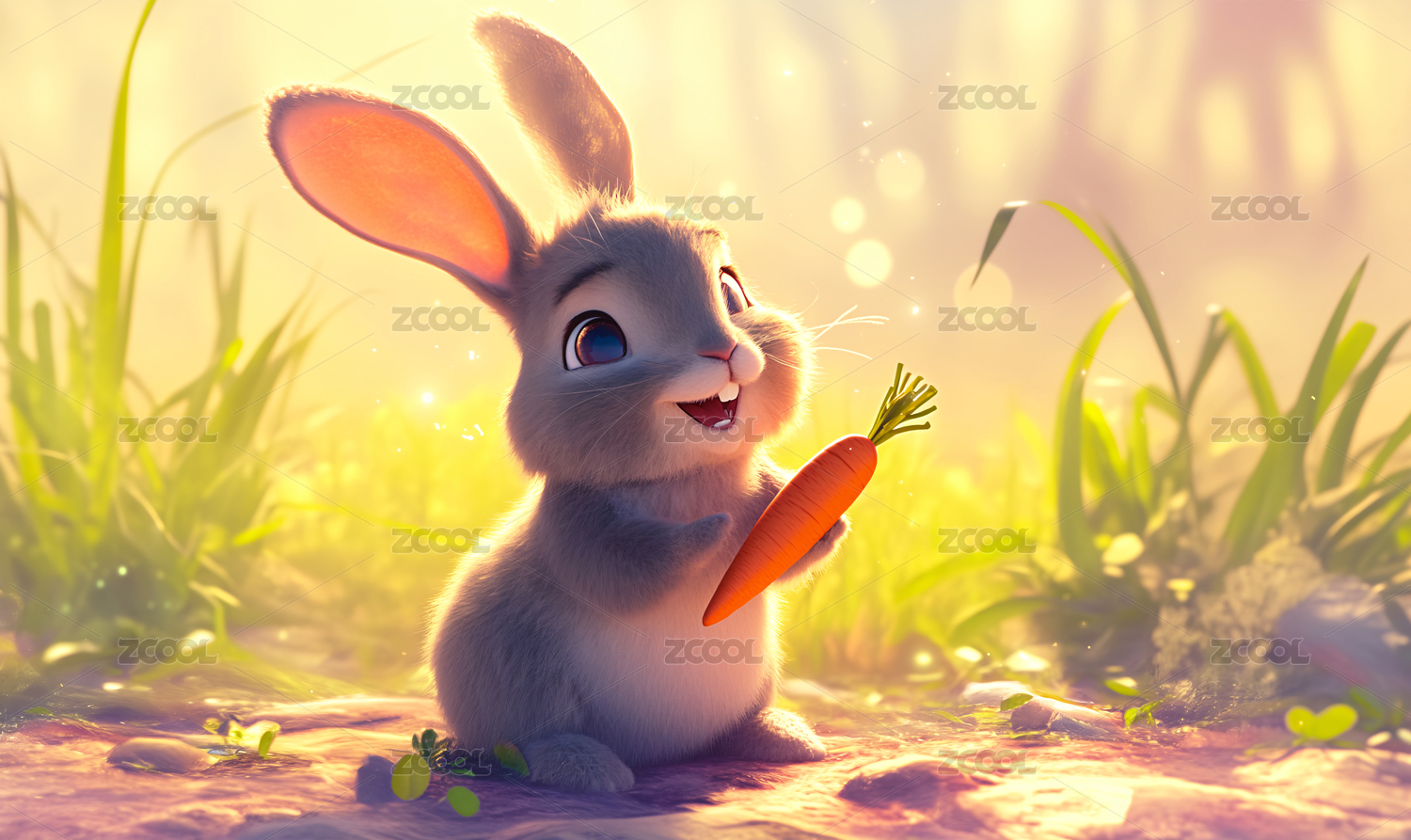 一只小兔子在黄昏的草丛中,3D卡通插画
