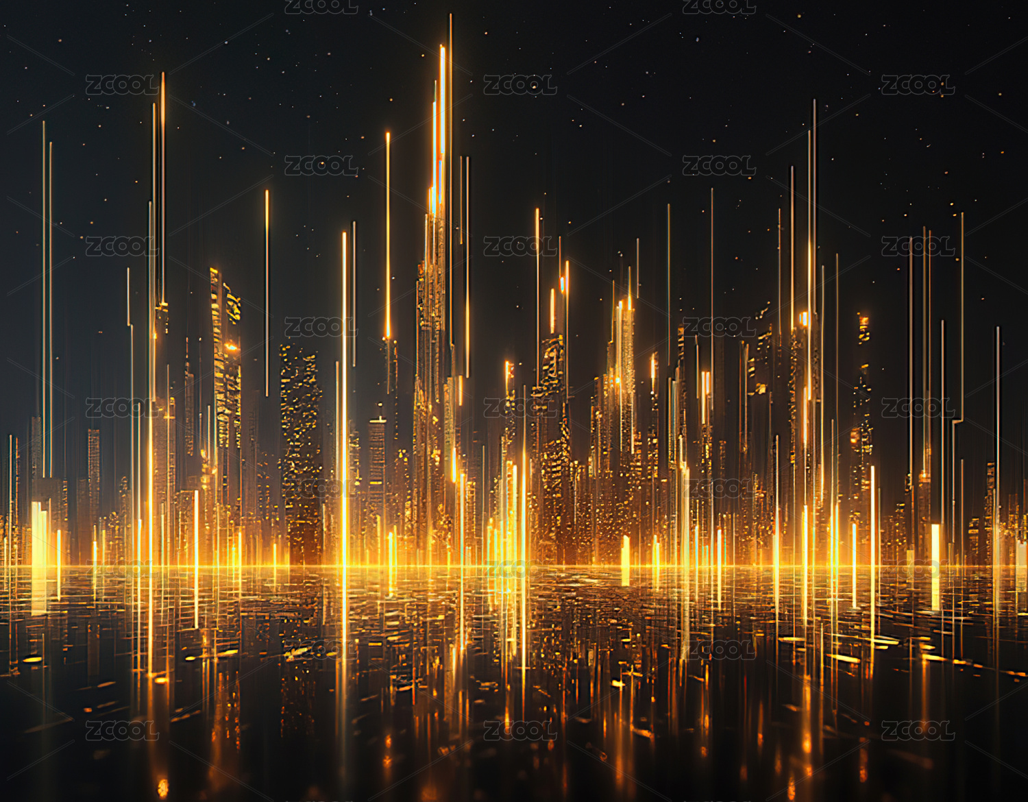 未来城市,科幻,夜景,金色,高楼大厦,灯光,光线,线条,反射,水面