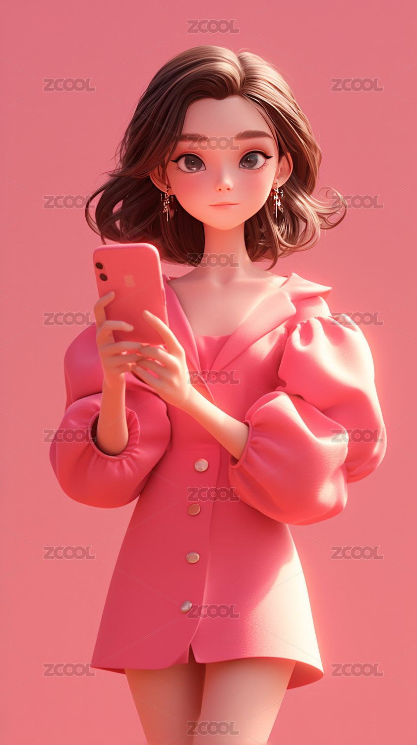 少女,花朵,手机,插画,3D,特写,粉色头发