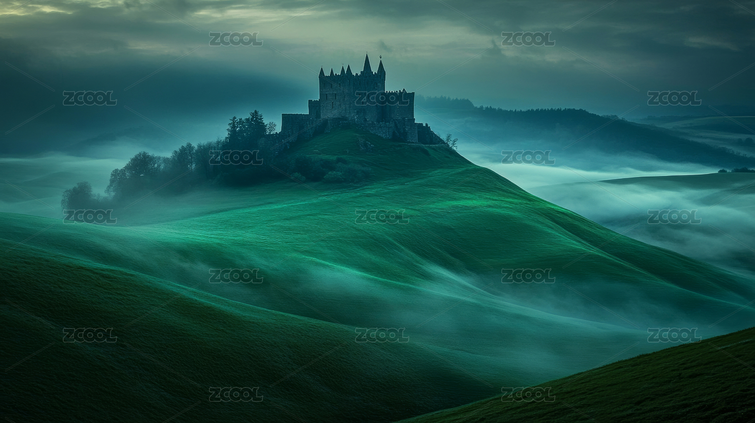 城堡,山顶,日落,天空,云,光,光线,树木,草,雾