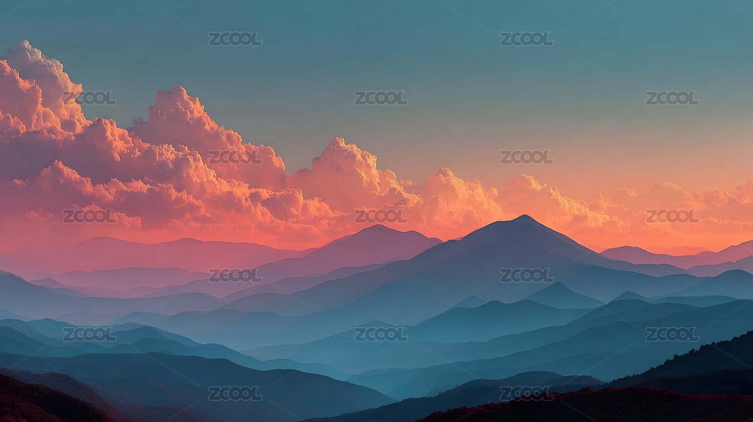 层叠山脉与晚霞