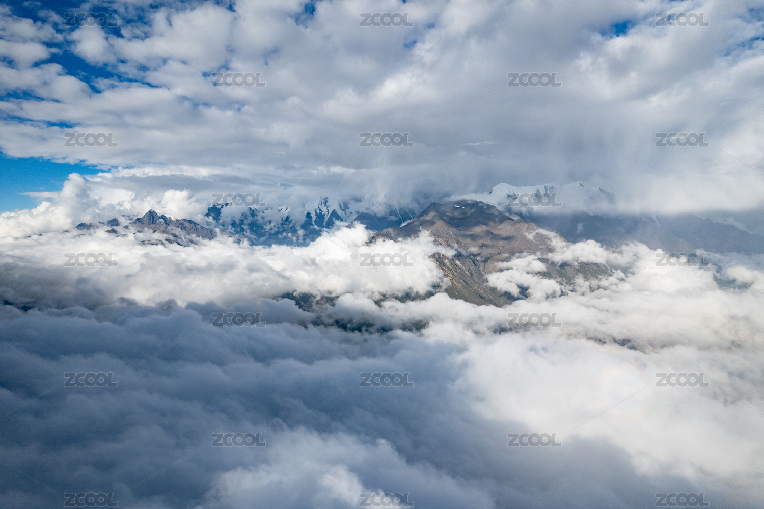 中国西藏萨普神山风景区耸立在云海中的雪山