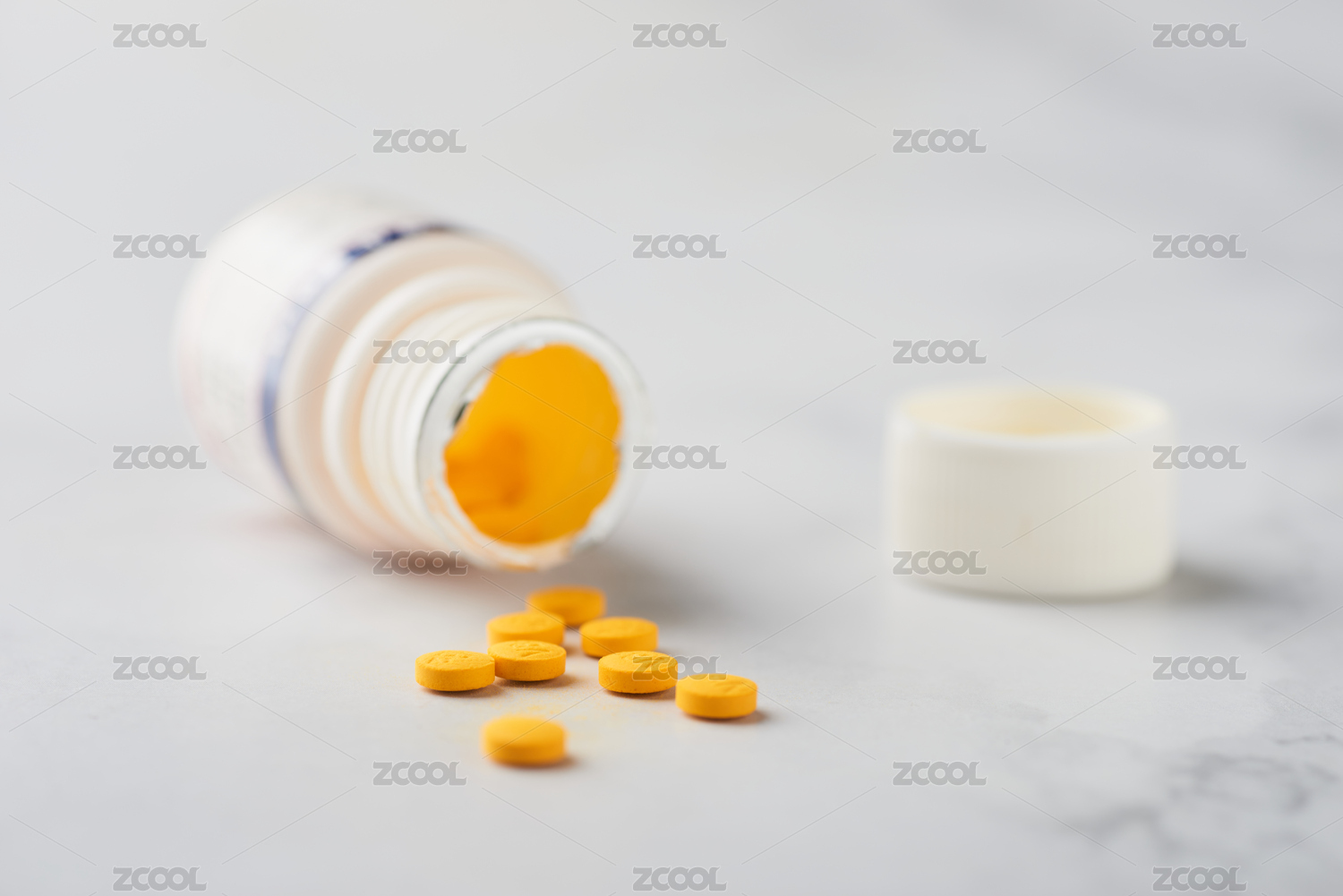 黄色药片从瓶子里倒出来蓝色背景
