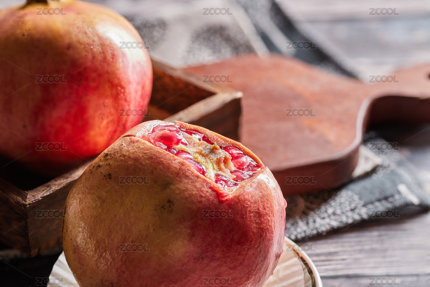 复古木纹桌子上的新鲜石榴