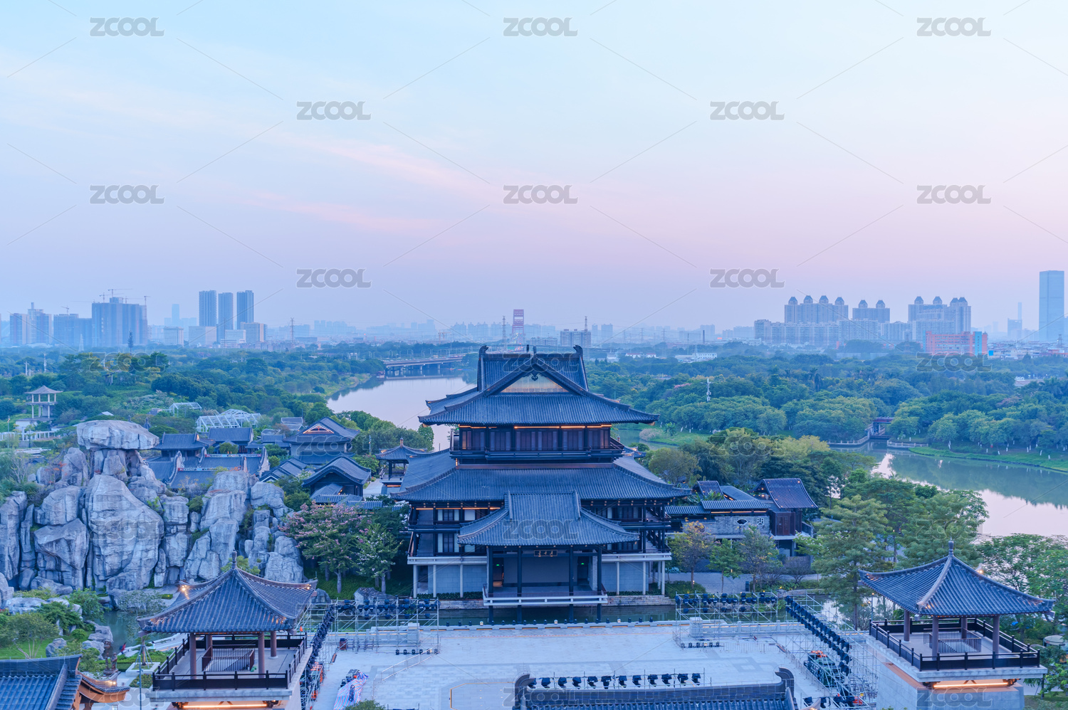 广州市文化馆中式传统建筑与海珠湖公园夕阳