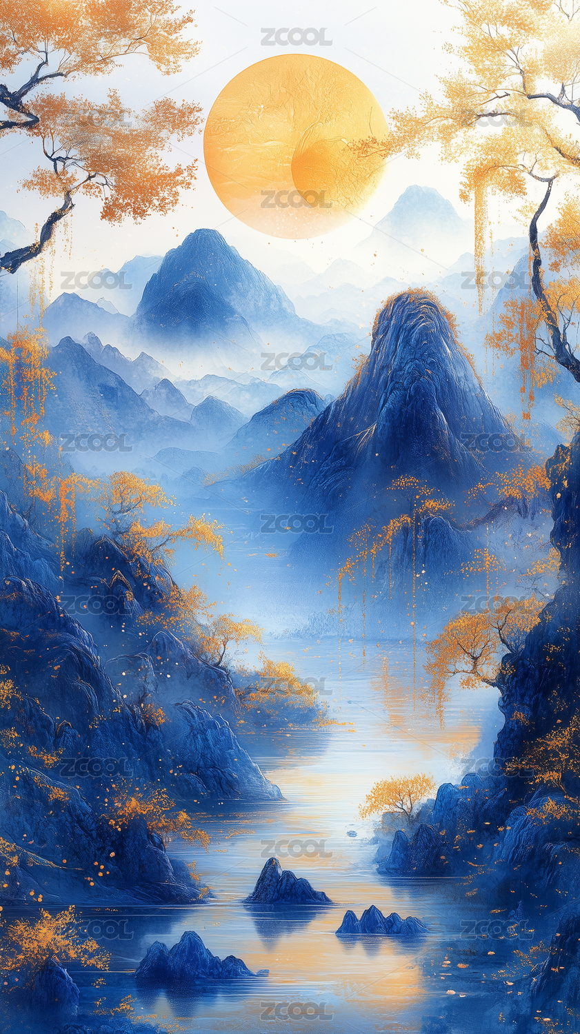艺术描金蓝调日出山水画海报背景