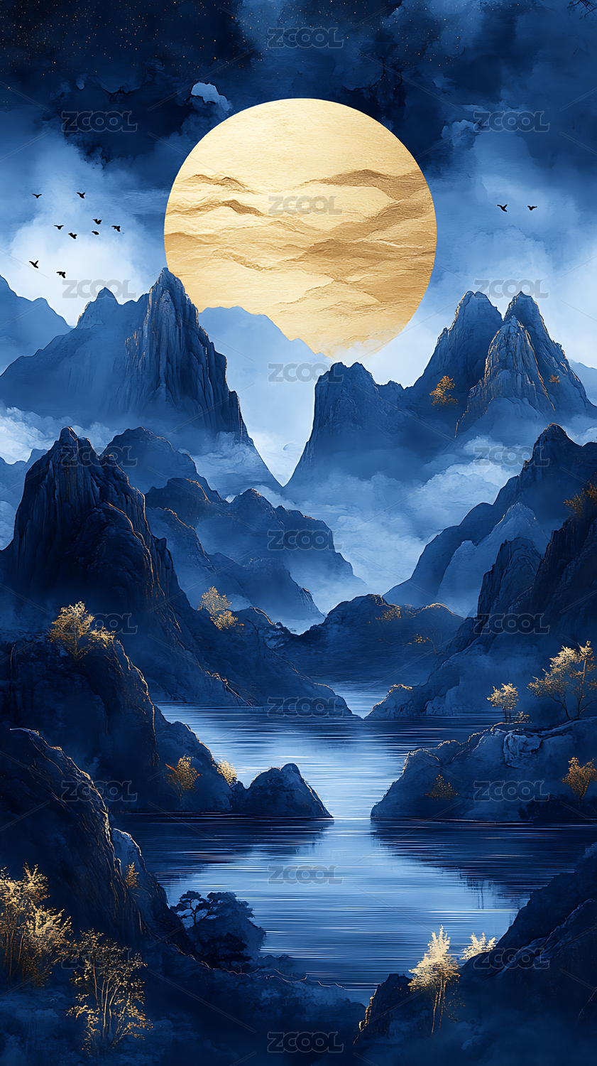 蓝色山水水墨金月意境