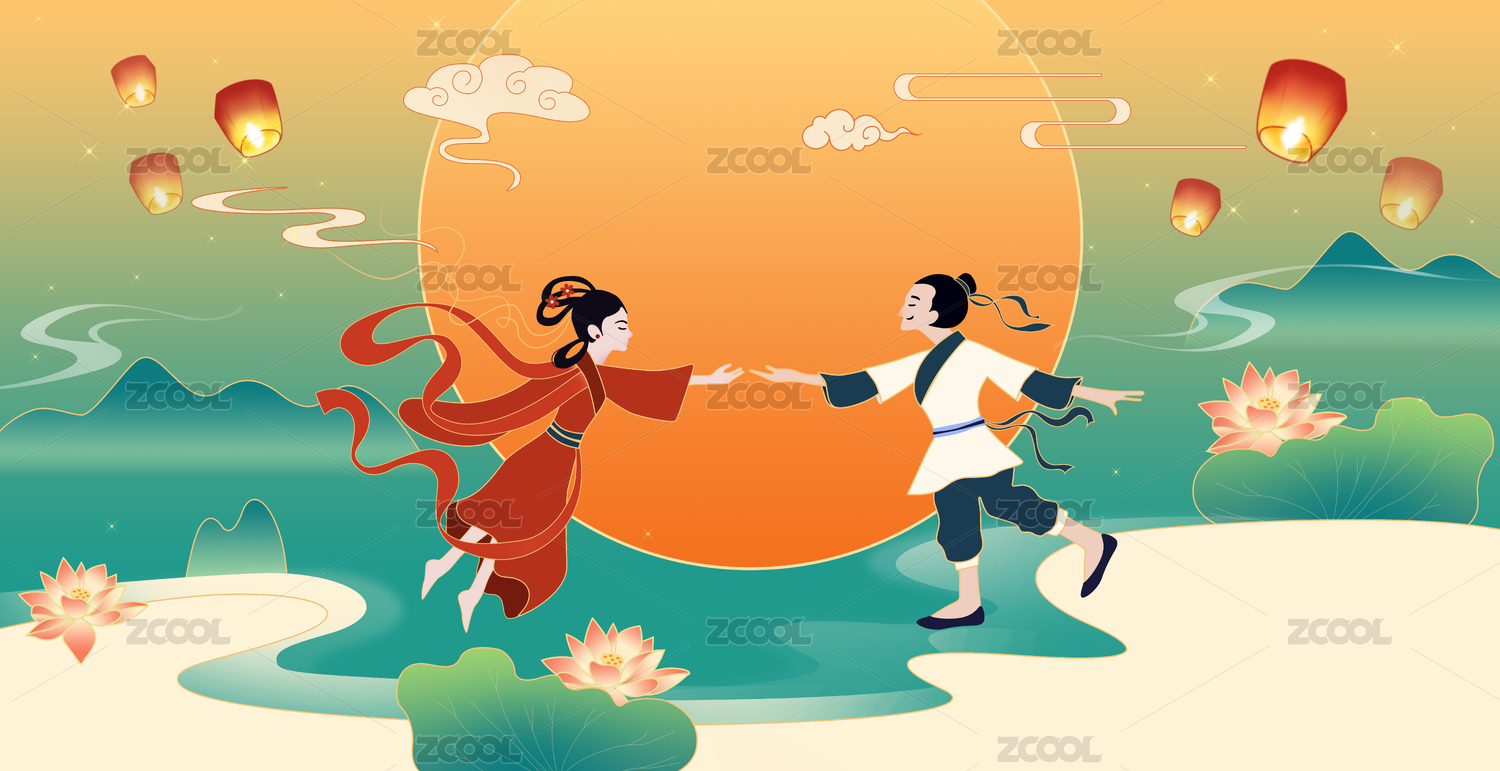 七夕鹊桥相会的牛郎织女国潮插画横版