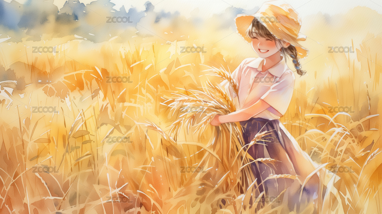 可爱的小女孩抱着麦穗在金黄的麦田里大笑