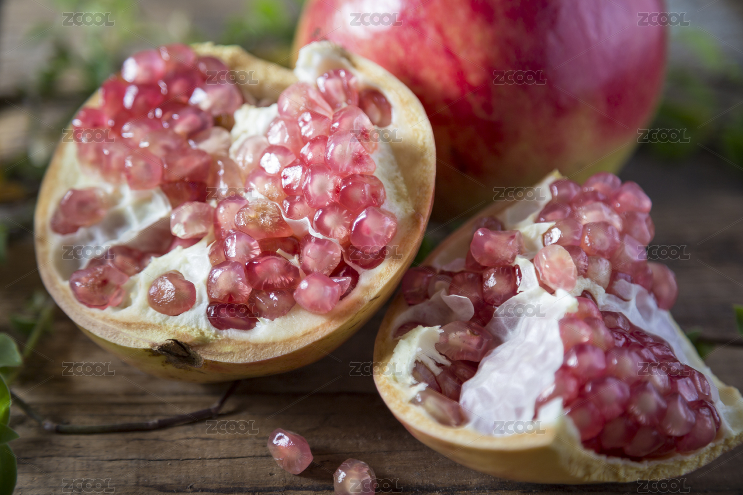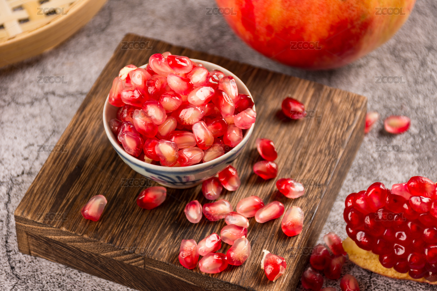 放在木纹背景上碟子里的红色酸甜石榴籽