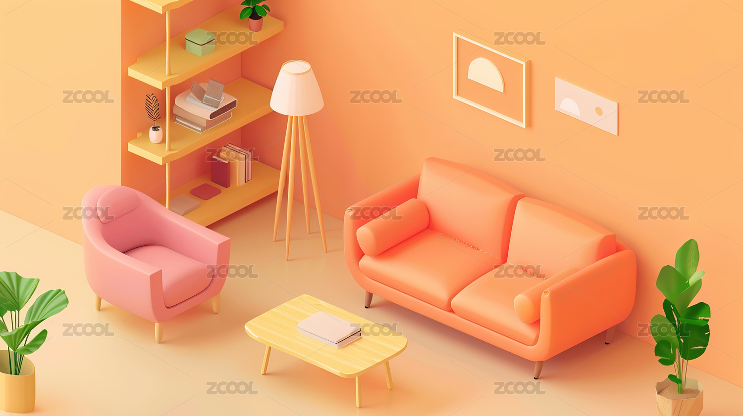 暖色客厅装修俯视立体轴测图3D卡通插画