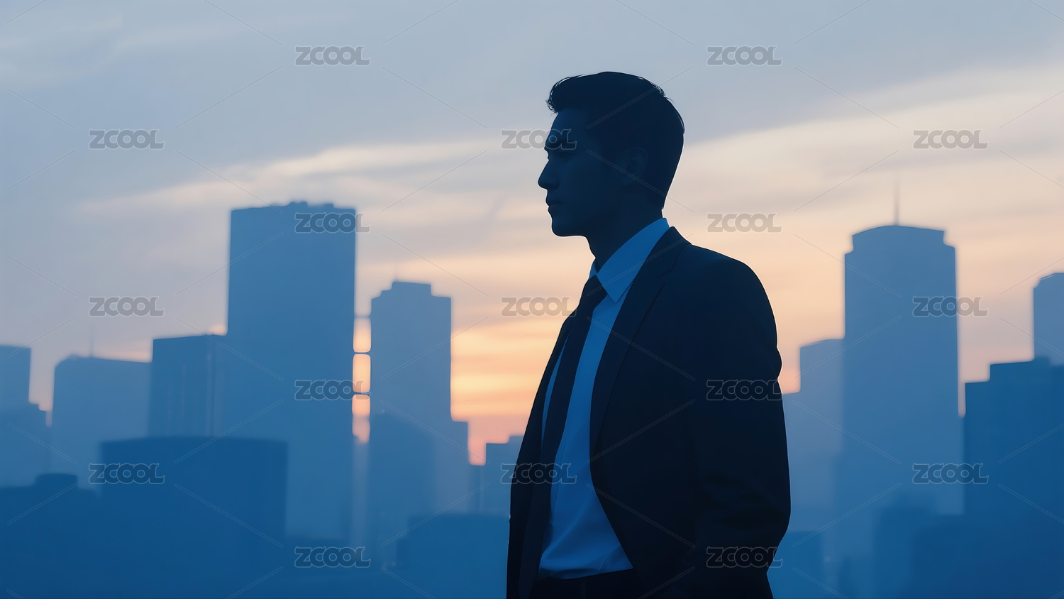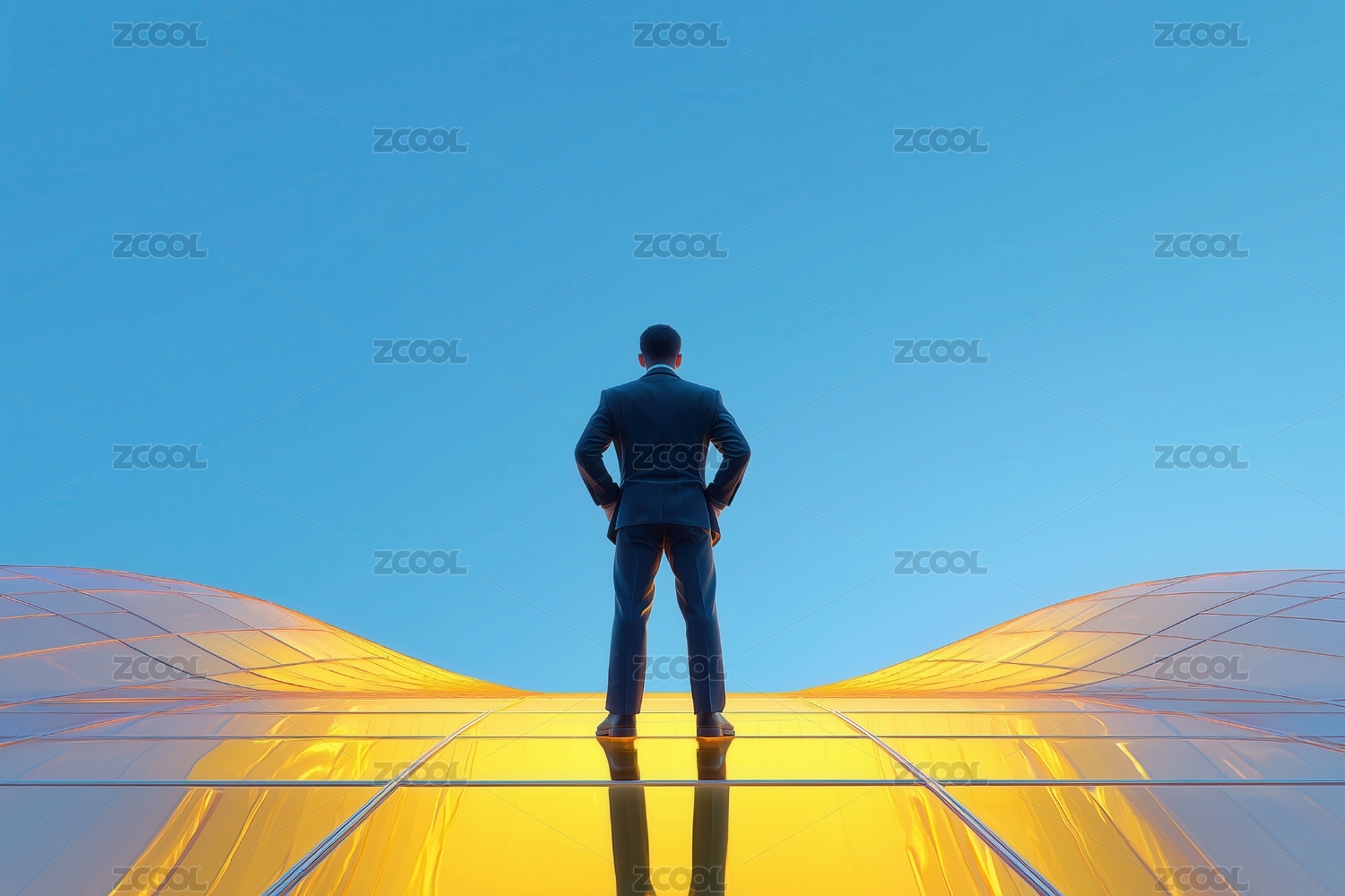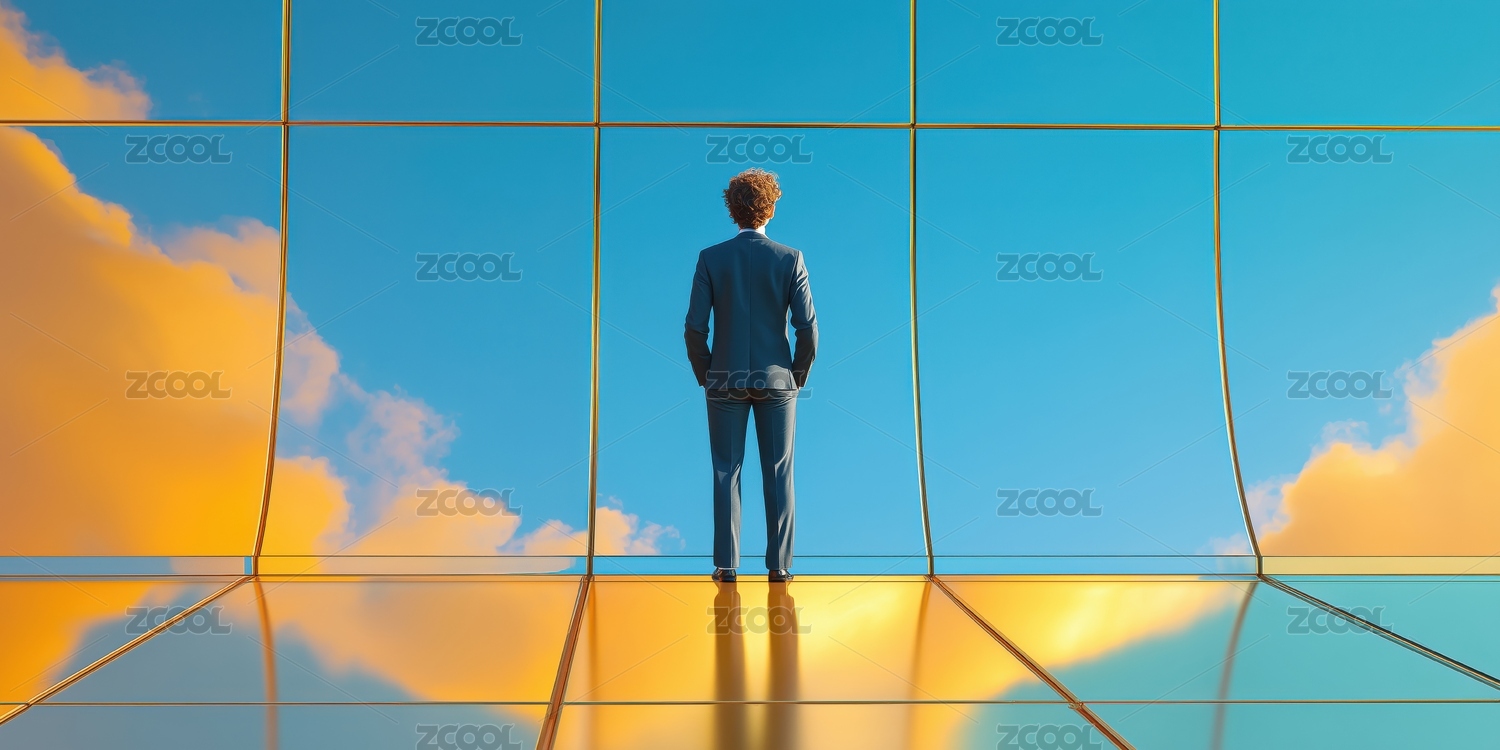 手绘彩色背景玻璃幕墙前西装男背影国漫插画