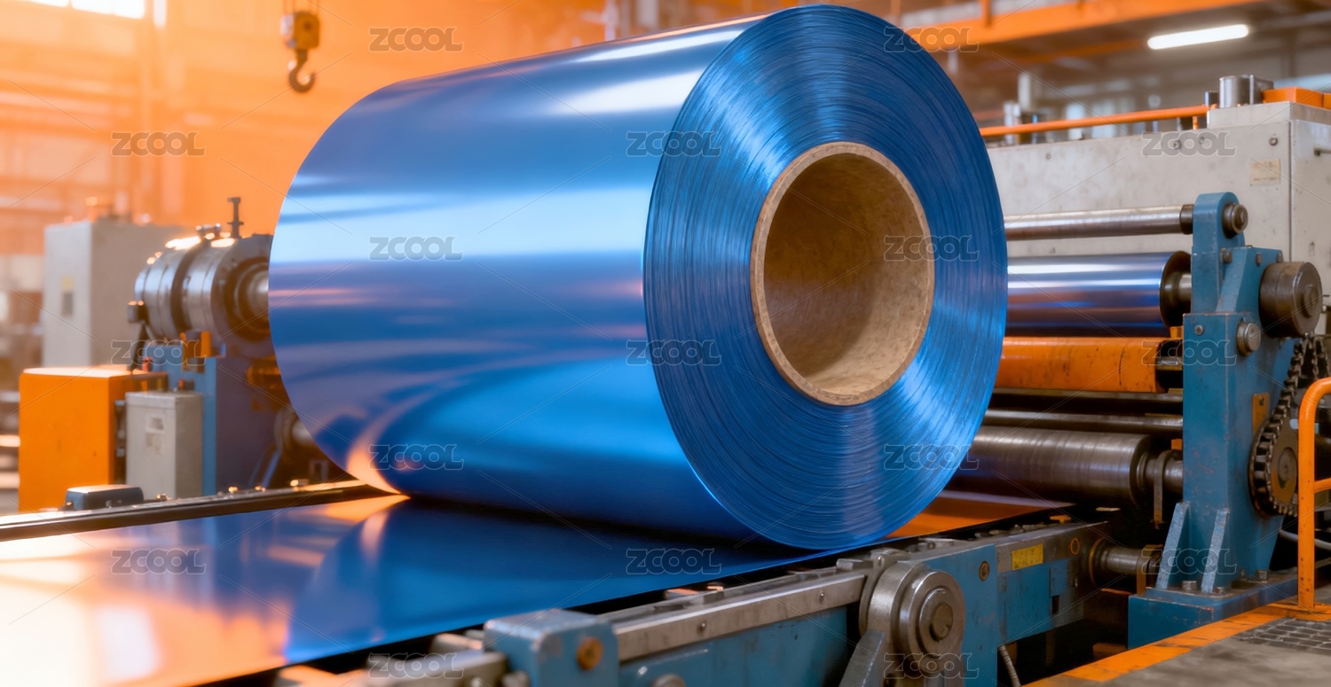现代工厂车间整齐排列钢卷特写中国制造概念