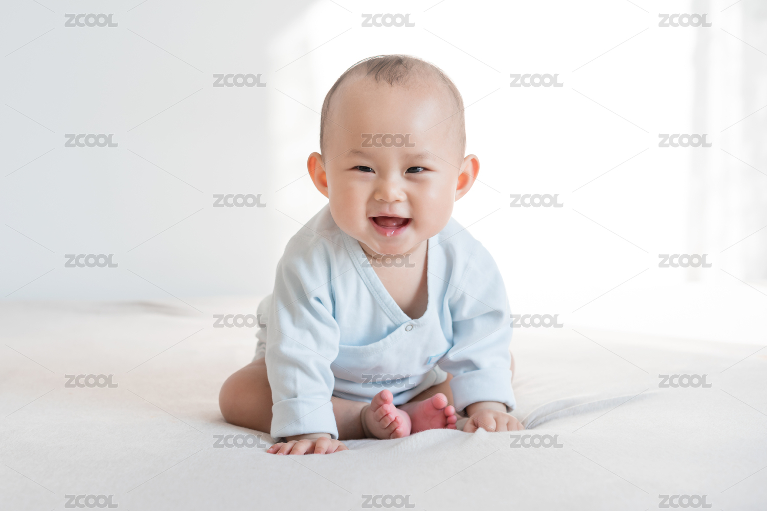 亚裔婴幼儿在床上爬行玩耍