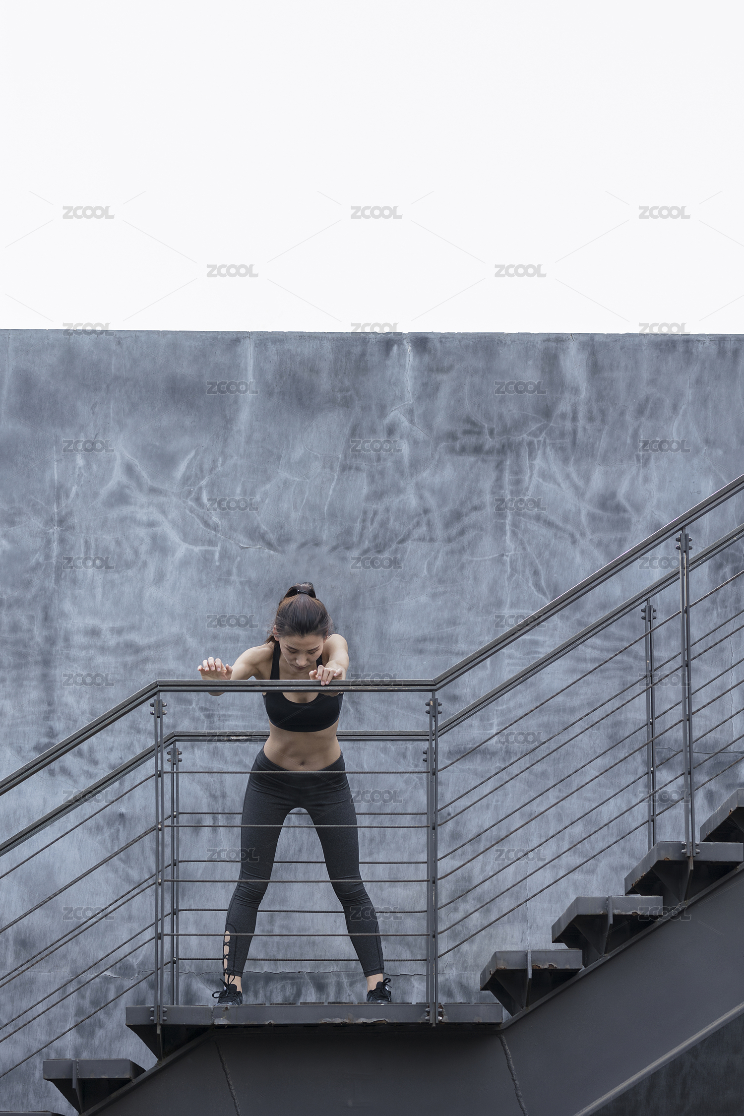 一名年轻的中国男性在城市里锻炼身体做拉伸
