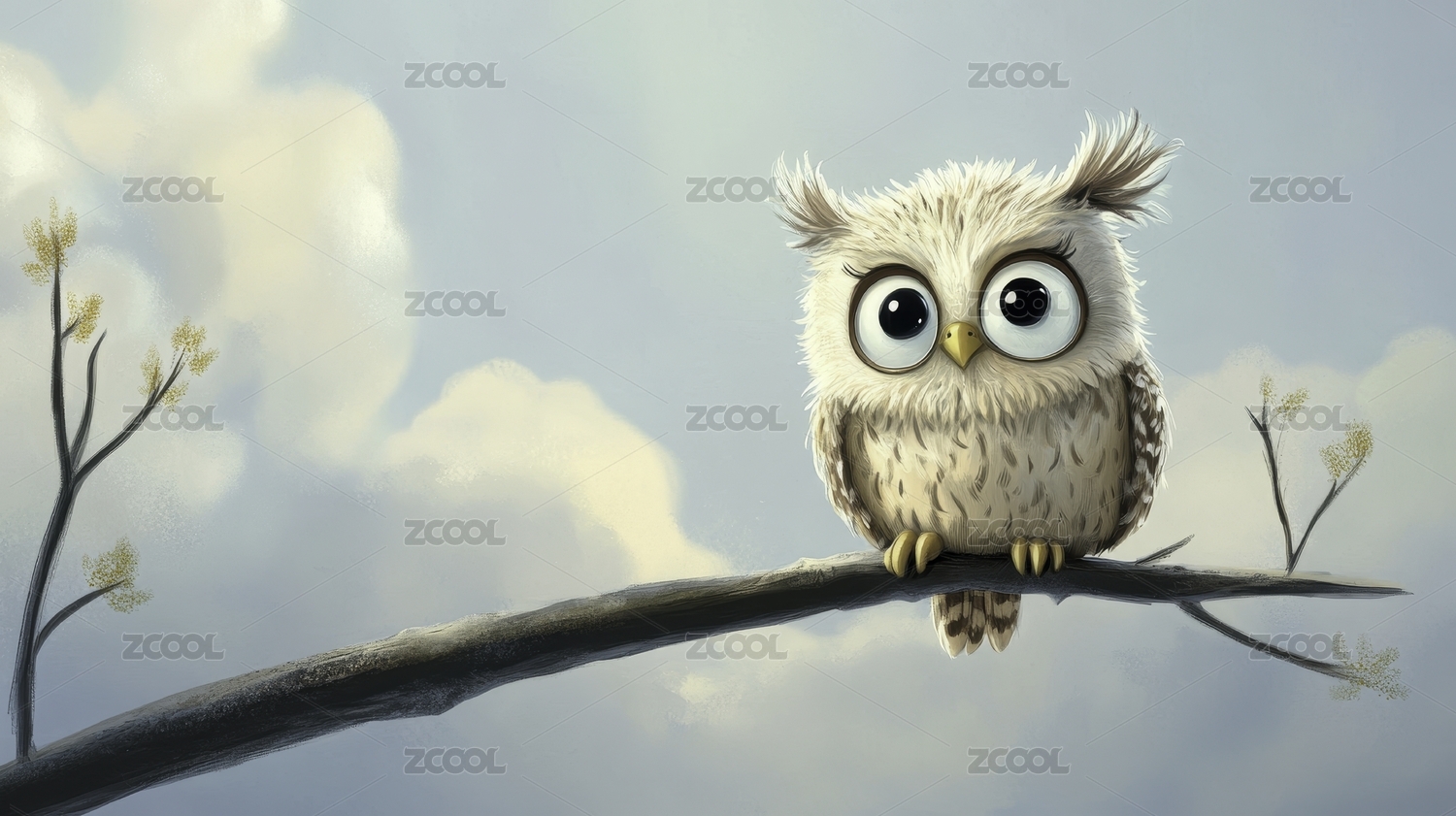 复古日漫可爱萌动物大眼睛猫头鹰站在树枝上