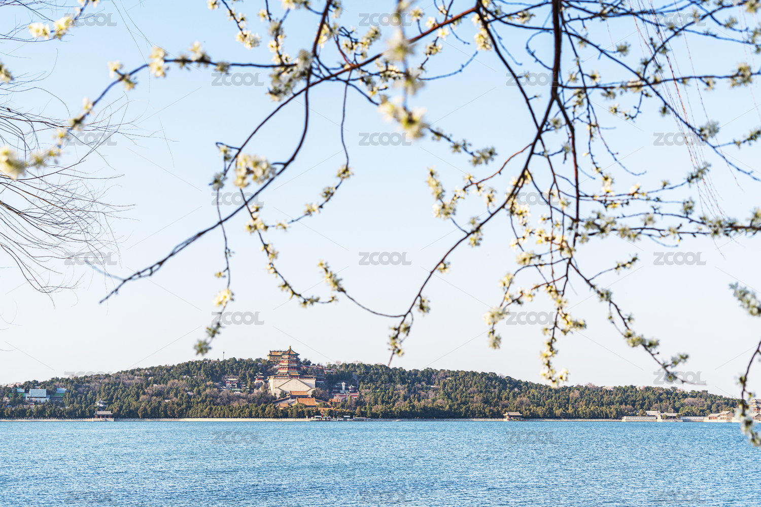 透过盛开的桃花树枝远眺颐和园佛香阁